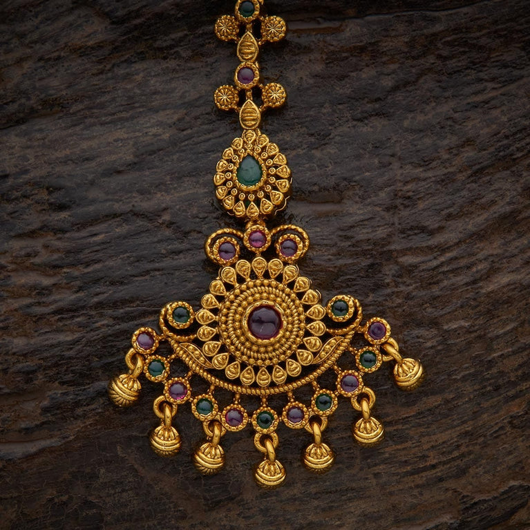 Kushal's Fashion Jewellery Antique TikkaA magnificent Tikka can make your outfit go from bland to eye-catching, which is why we present our latest antique Tikka. The best part of this Tikka is the gold polish that compliments the shine of the ruby, green, and ruby-green stones used in it. Wear it with your favourite outfit.