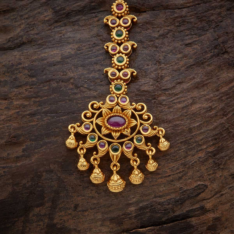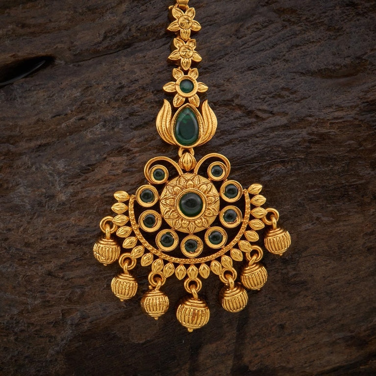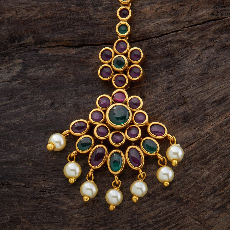 Kushal's Fashion Jewellery Flower Motif Antique TikkaMaang tikka, made for the perfect bling, was developed for today's society. A maang tikka is perfect for every occasion and comes in various colors to suit your unique preferences. This maang tikka is constructed of ruby-green, green and ruby beads, and artificial stones, giving you a festive look. It has a floral motif with rubies incorporated in it.