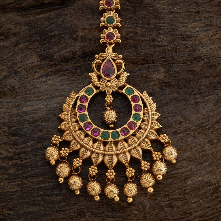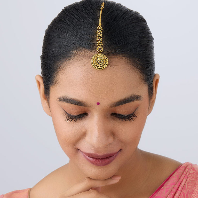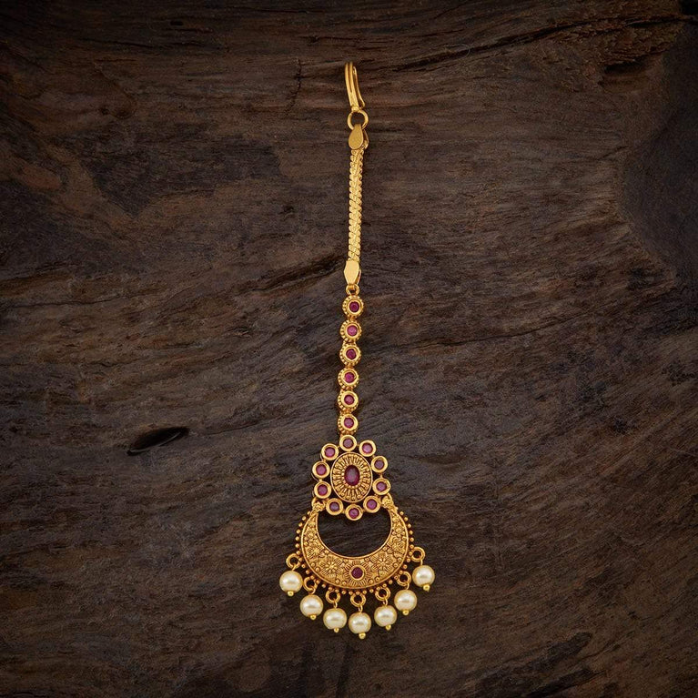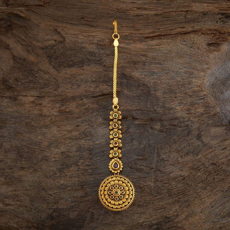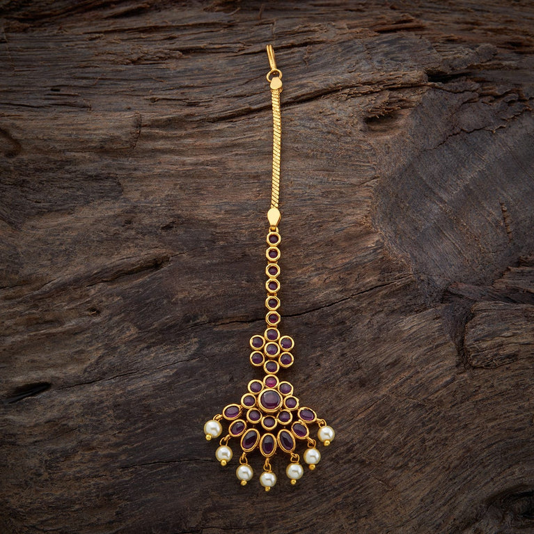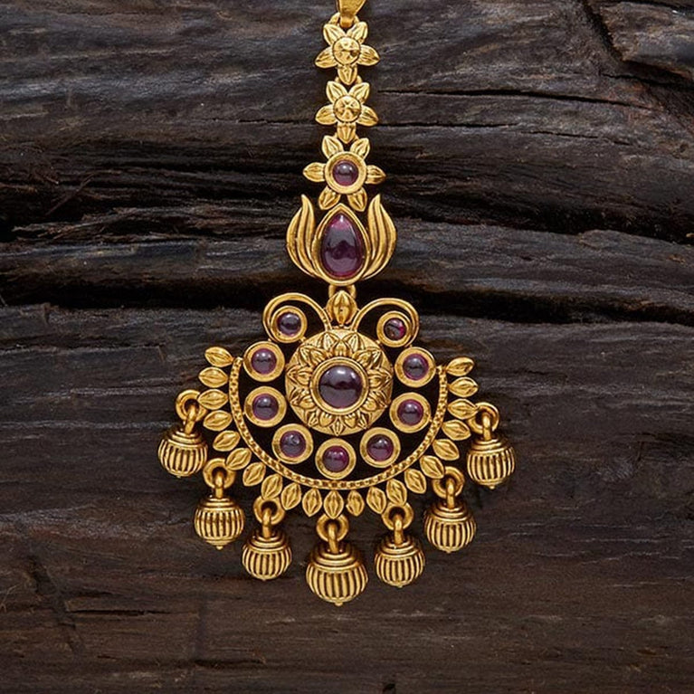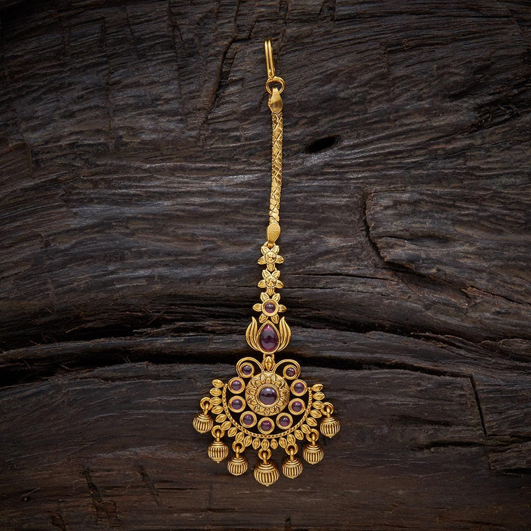 Kushal's Fashion Jewellery Flower Motif Antique TikkaLooking for some beautiful hair accessories for a traditional event? This antique Tikka is a perfect piece to add to your traditional look. The floral carving and tiny leaf design embellished with Ruby stones and hanging pearls are alluring enough for a stunning presence. Style it with loose hair or any other hairstyle and impress everyone on this festive occasion.
