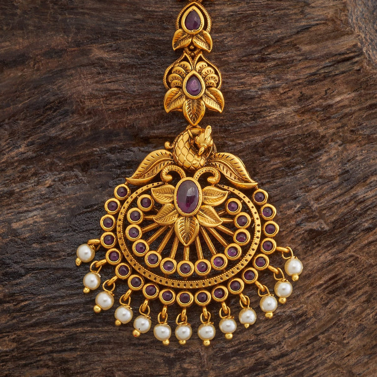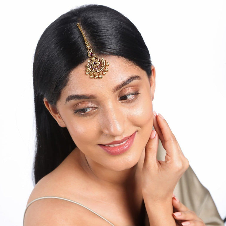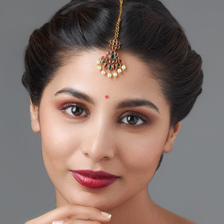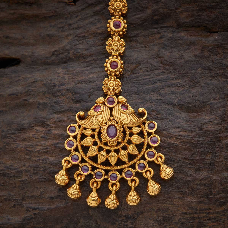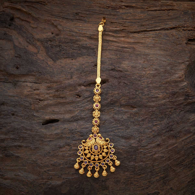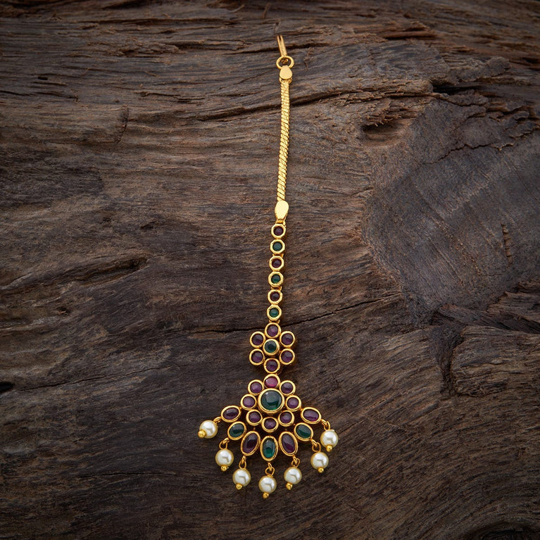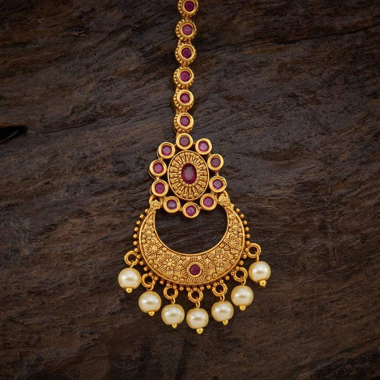 Kushal's Fashion Jewellery Flower Motif Antique TikkaLooking for some beautiful hair accessories for a traditional event? This antique Tikka is a perfect piece to add to your traditional look. The floral carving and tiny leaf design embellished with Ruby stones and hanging pearls are alluring enough for a stunning presence. Style it with loose hair or any other hairstyle and impress everyone on this festive occasion.