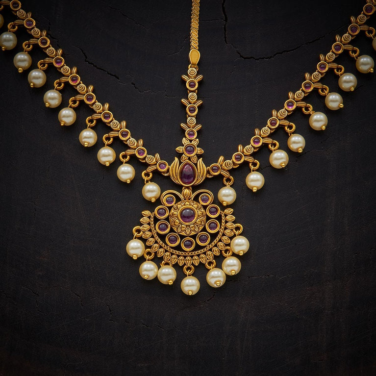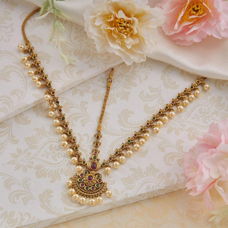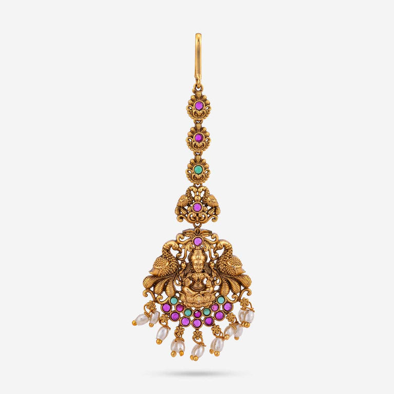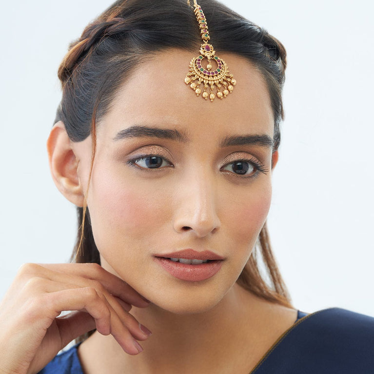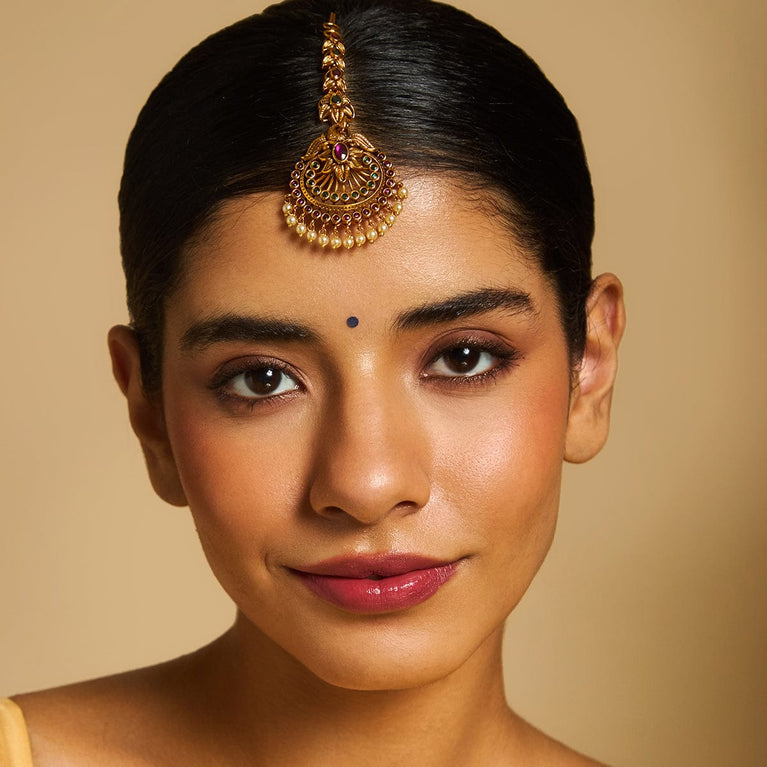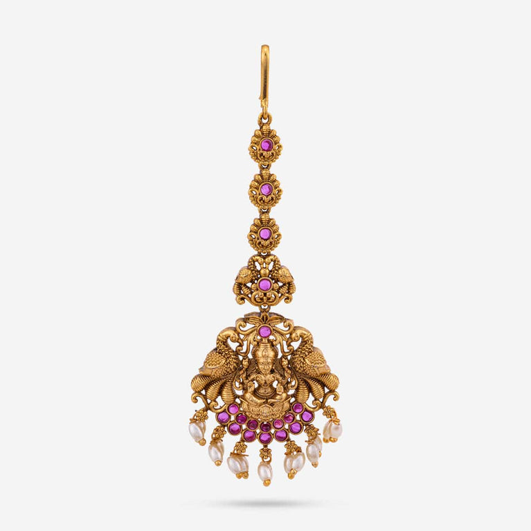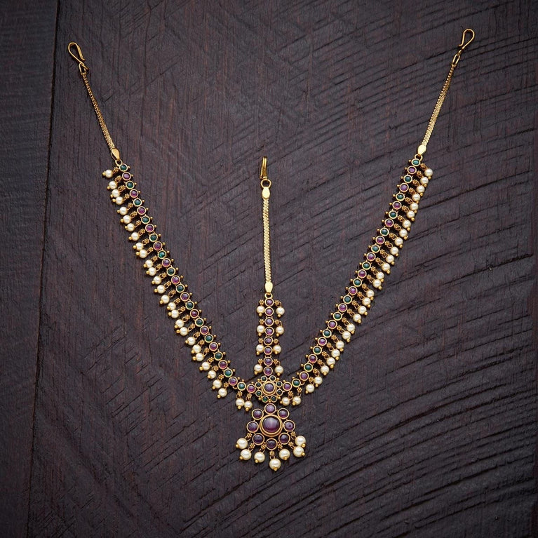 Kushal's Fashion Jewellery Flower Motif Antique TikkaLooking for some beautiful hair accessories for a traditional event? This antique Tikka is a perfect piece to add to your traditional look. The floral carving and tiny leaf design embellished with Ruby stones and hanging pearls are alluring enough for a stunning presence. Style it with loose hair or any other hairstyle and impress everyone on this festive occasion.