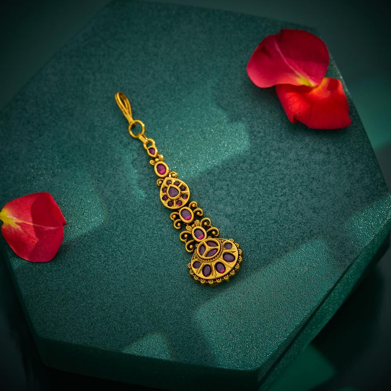 Kushal's Fashion Jewellery Flower Motif Antique TikkaIdeal for those who appreciate the charm and elegance of a decent look! Crafted with precision, our antique tikka boasts a queenly allure that never fails to wow. It's encrusted with brilliantly gleaming synthetic ruby and green-coloured stones, which adds an irresistible sparkle to your regal charm. Known for its decent appearance, it blends the traditional aesthetic with a contemporary sensibility.