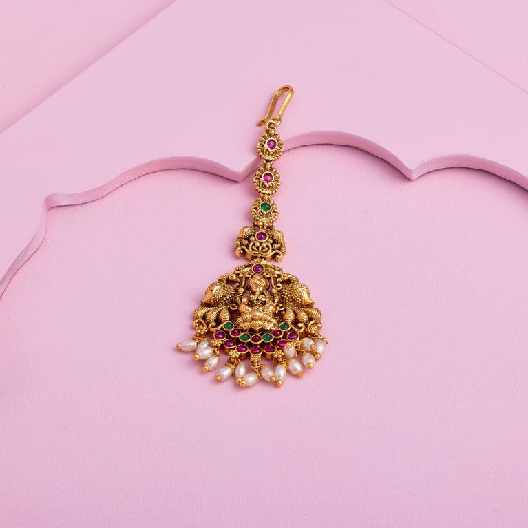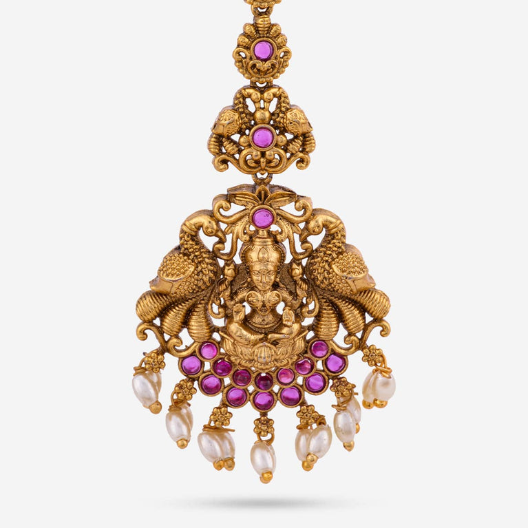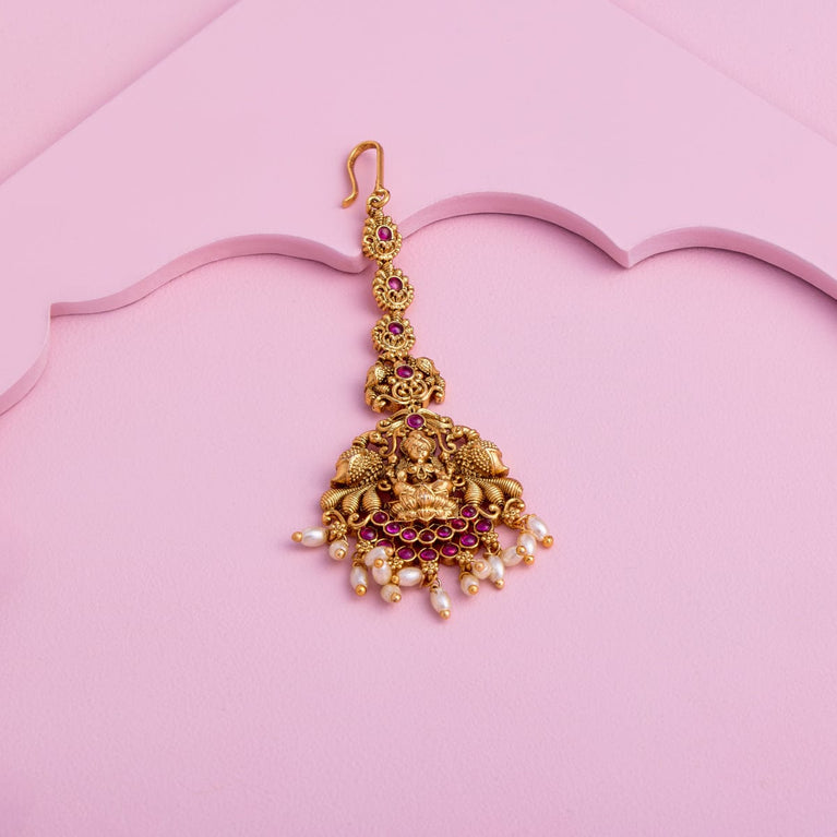 Ruby Bridal Maang Tikka With Stones & BeadsFeel all queenly as you style this mesmerizing bridal maang tikka from our collection. This jaw-dropping ruby beauty has a copper alloy base and a goddess Lakshmi design in the middle. This wholesome design is adorned with stones and beads in the most lavish way. This stunning beauty upswing your bridal attire like a spell!
