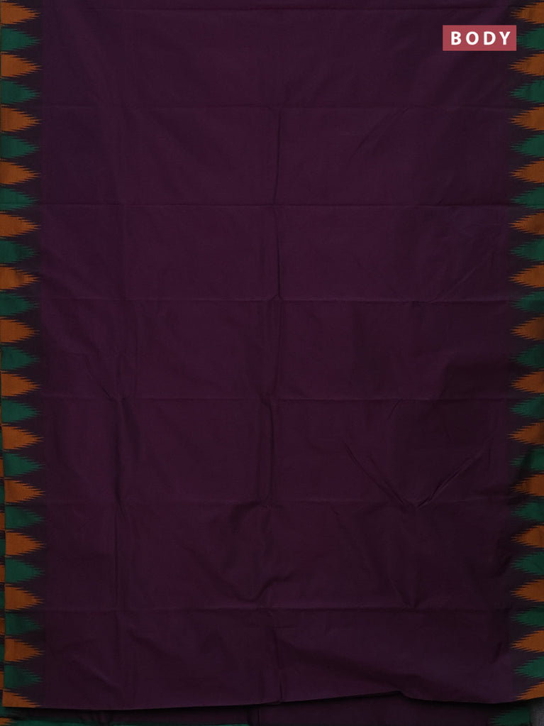 Arani semi silk saree deep purple and green mustard yellow with plain body and temple design border