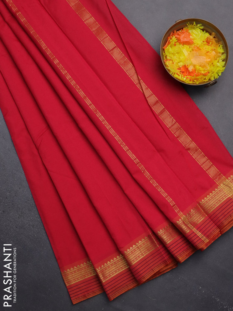 Arani semi silk saree red and dual shade of yellow with plain body and zari woven simple border