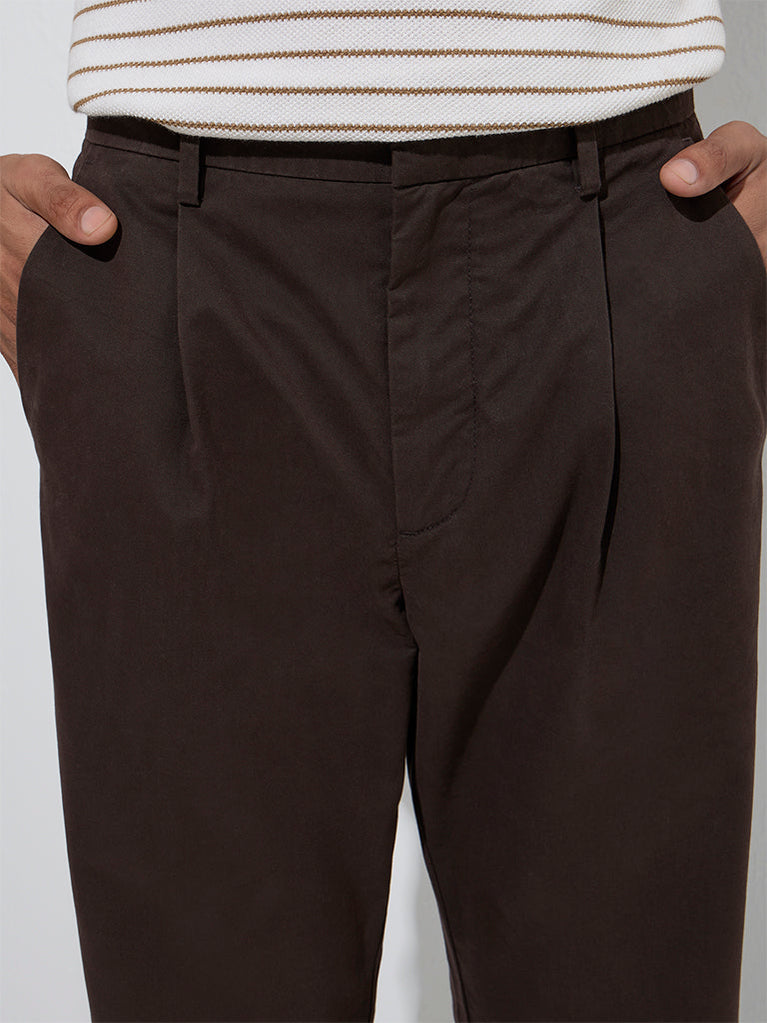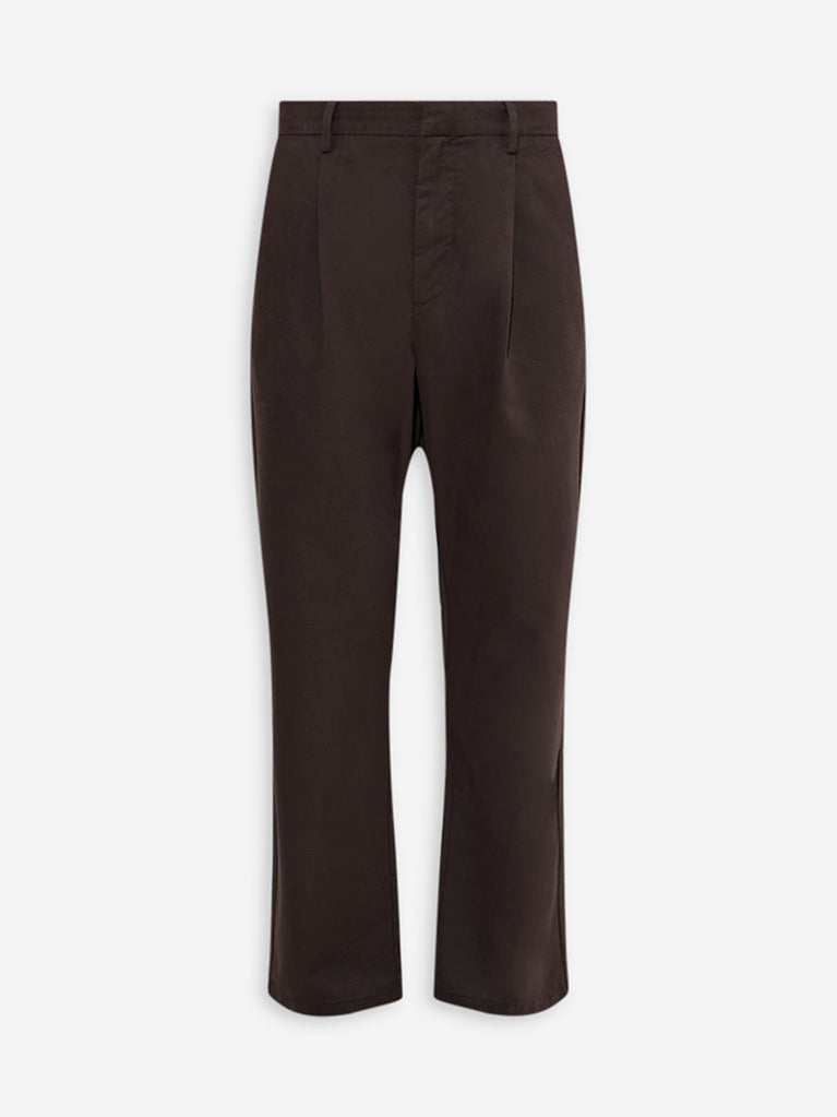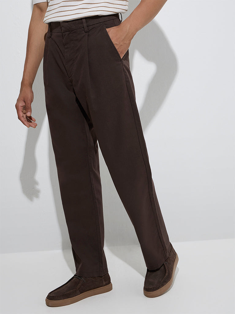 Ascot Brown Relaxed-Fit Mid-Rise Cotton-Blend Trousers