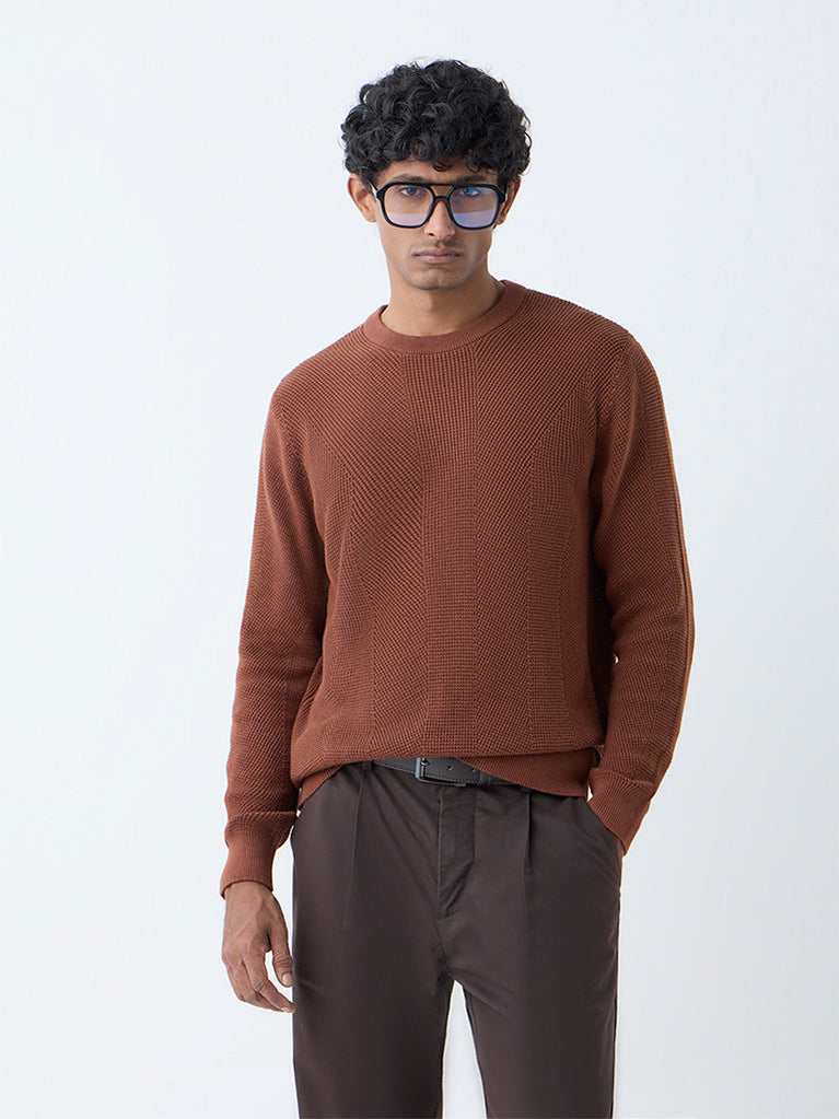 Ascot Brown Knit-Textured Relaxed-Fit Cotton Sweater