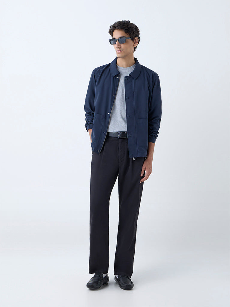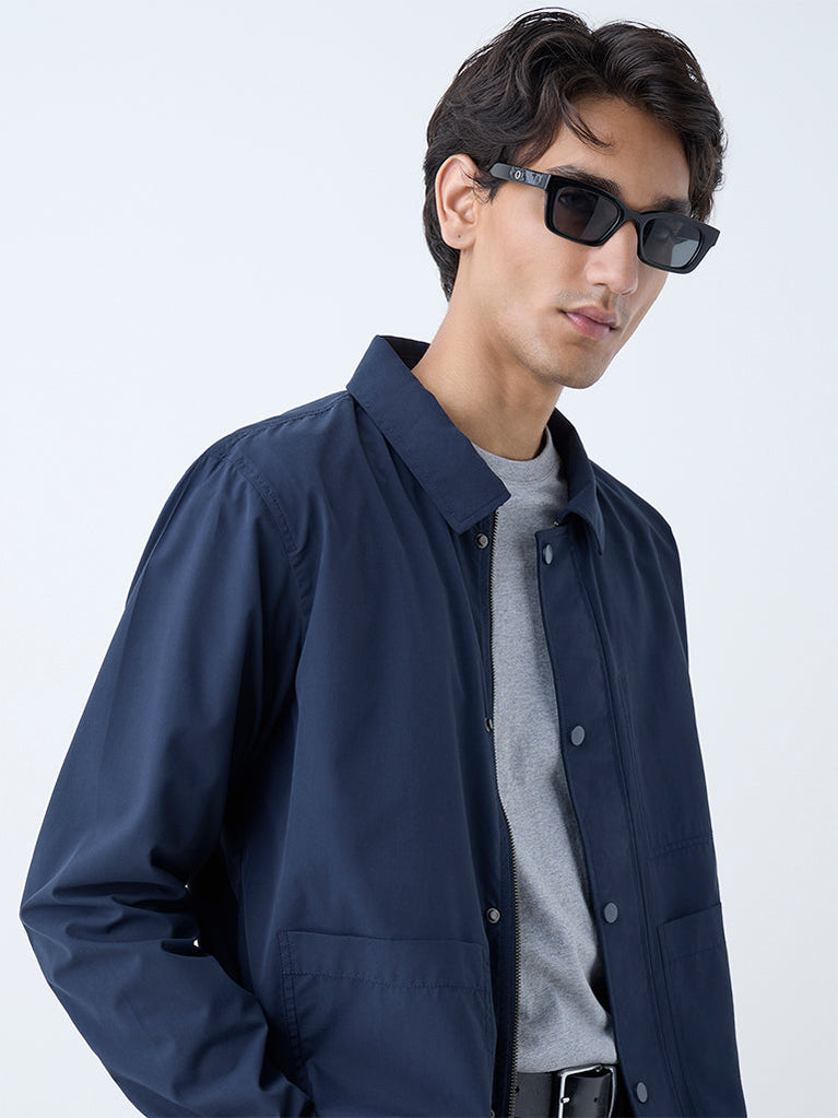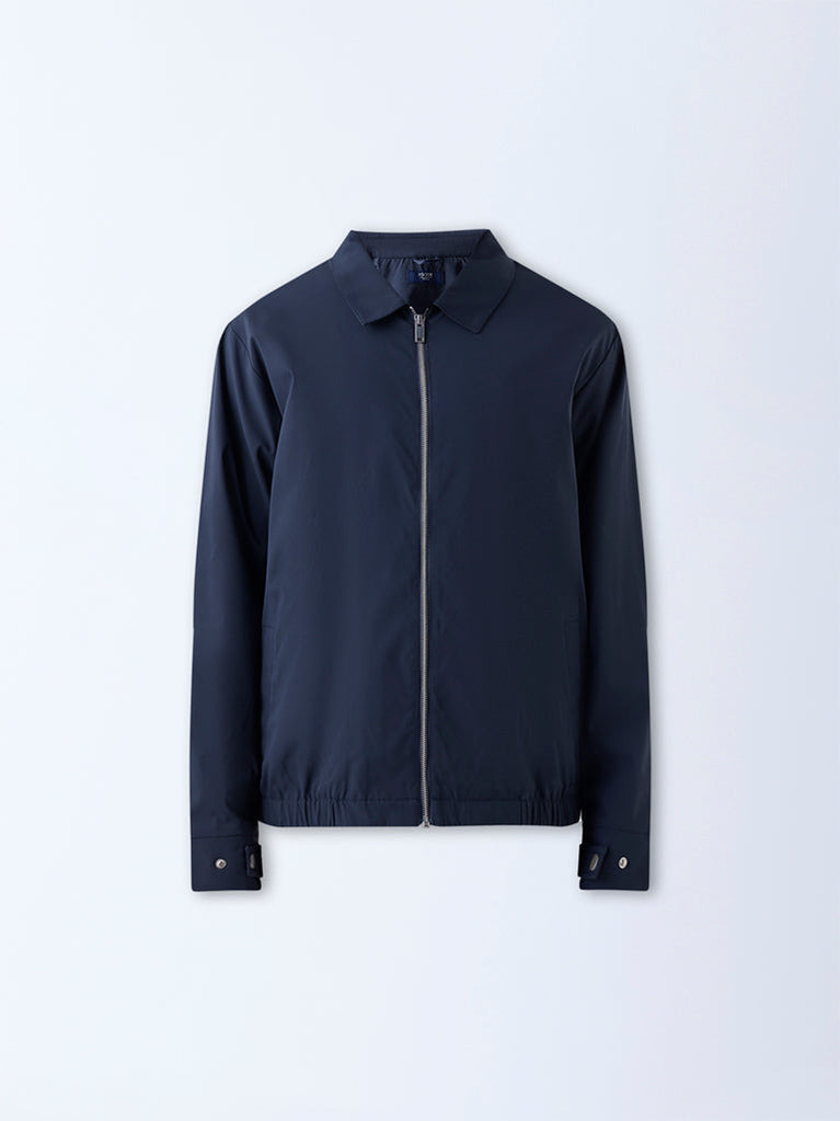 Bring polish to off-duty moments with this navy solid jacket from Ascot. Styled with a spread collar and streamlined zip front, the relaxed frame and full sleeves offer a balance of comfort and refinement.