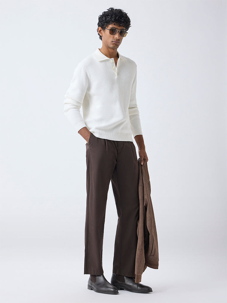 Ascot elevates the everyday knit with this off-white polo sweater, crafted from a textured cotton-blend fabric. Its relaxed handle meets a spread collar and quarter button placket, while full sleeves lend it a polished yet cozy feel—perfect for crisp mornings and easy transitional layering.
