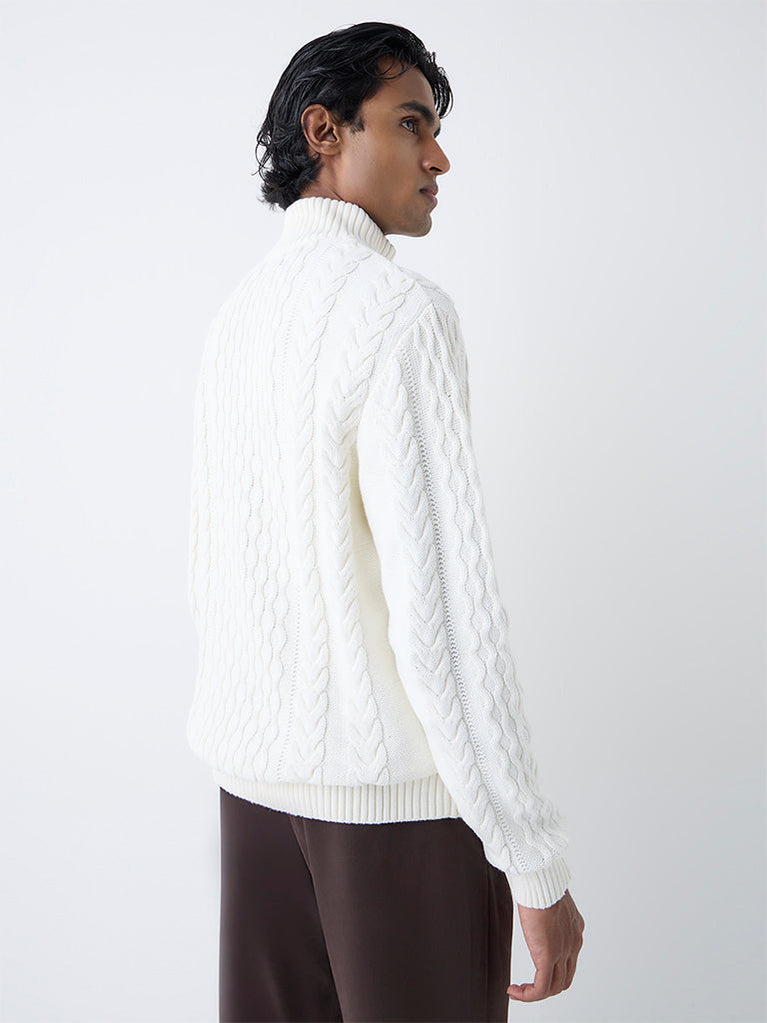 Ascot presents this off-white sweater featuring a high neck, a short zipper closure and full sleeves for a clean, structured look. Knitted from pure cotton fabric, it is finished with a cable-knit pattern that brings depth to the design. Soft, warm and effortlessly stylish, it stands out as a dependable choice for the winter season.