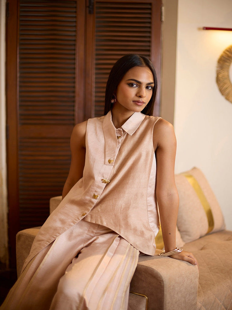 This cream top captures the essence of festive elegance with ease. Designed sleeveless with a collared neckline, it flows into an asymmetric hem that adds a graceful edge. The metallic buttons glimmer like subtle embellishments, making it an effortless choice for daytime celebrations and evening soirées alike.