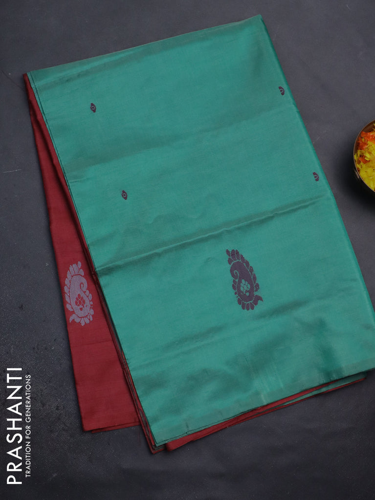 Banana pith saree teal green shade and maroon with thread woven buttas in borderless style