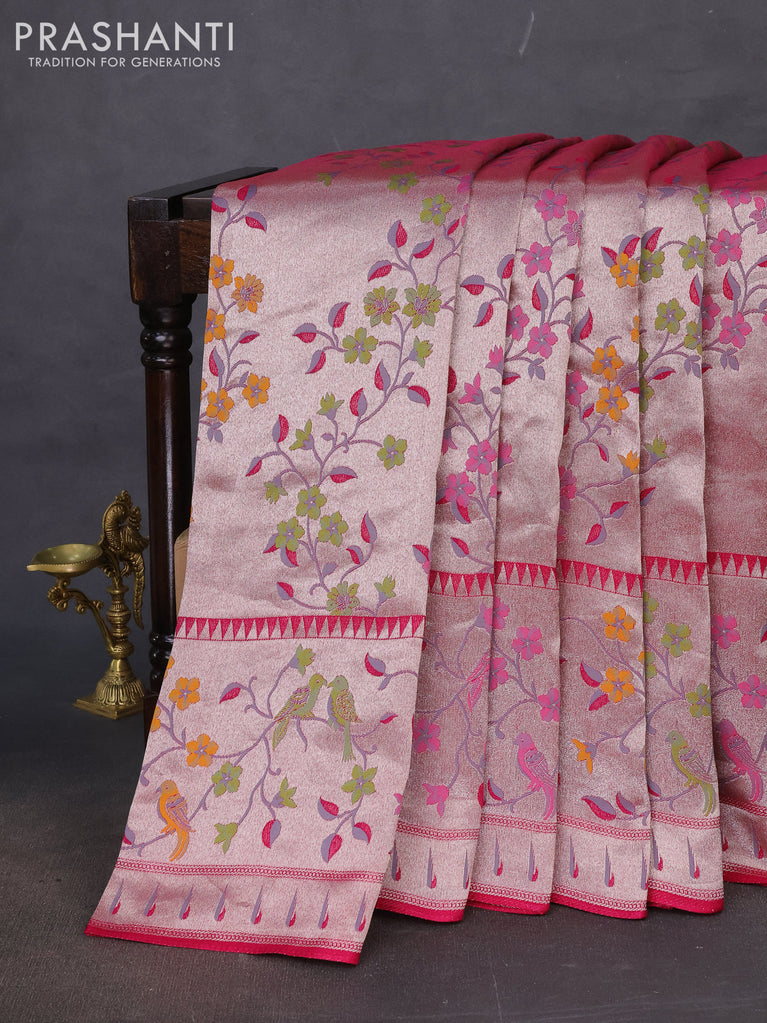 Banarasi semi raw silk saree pink with zari woven floral design paithani weaves and floral design paithani border