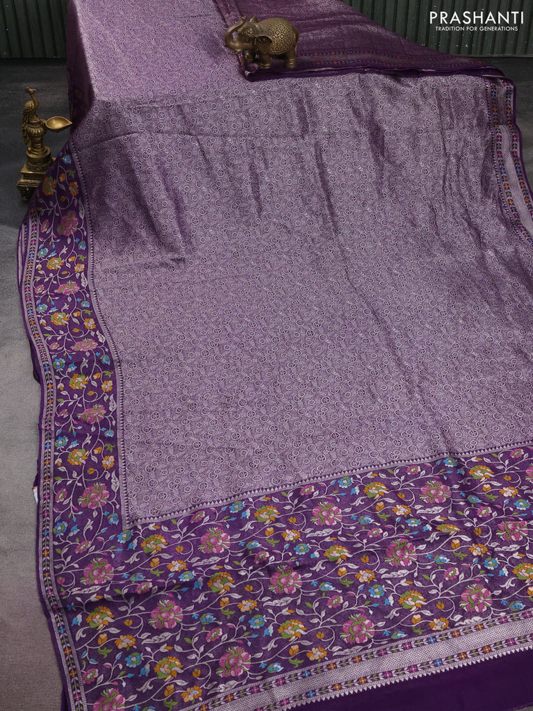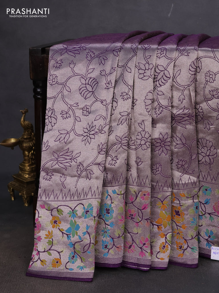 Banarasi semi raw silk saree violet with allover silver zari woven floral weaves and floral design paithani border