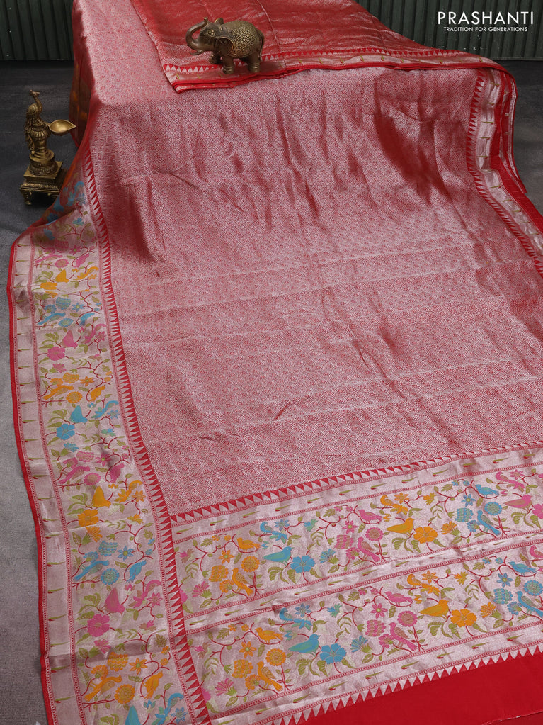 Banarasi semi raw silk saree red with allover silver zari woven paithani weaves and woven border