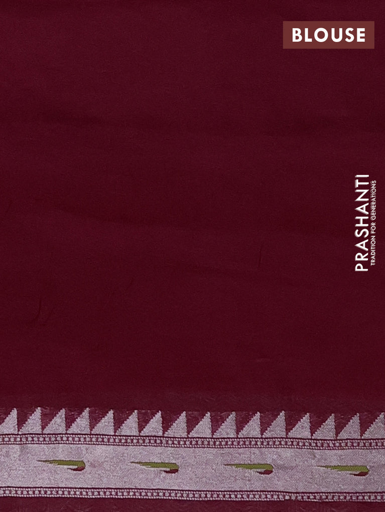 Banarasi semi raw silk saree wine shade with allover silver woven brocade weaves and floral design paithani border