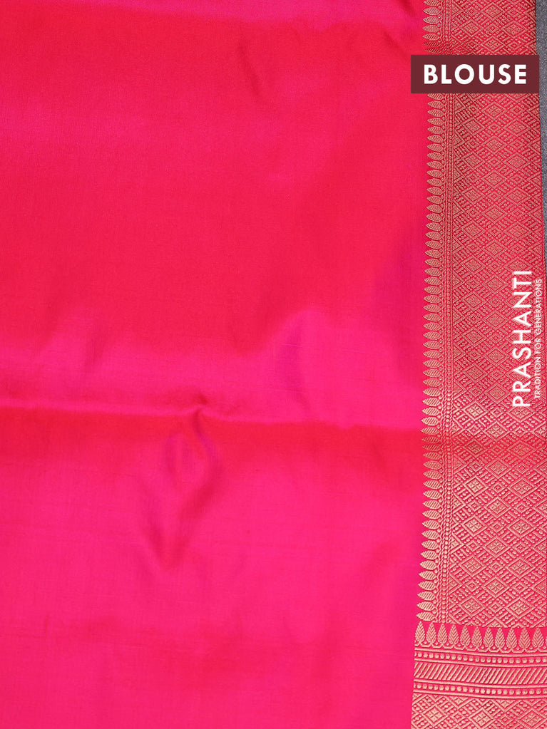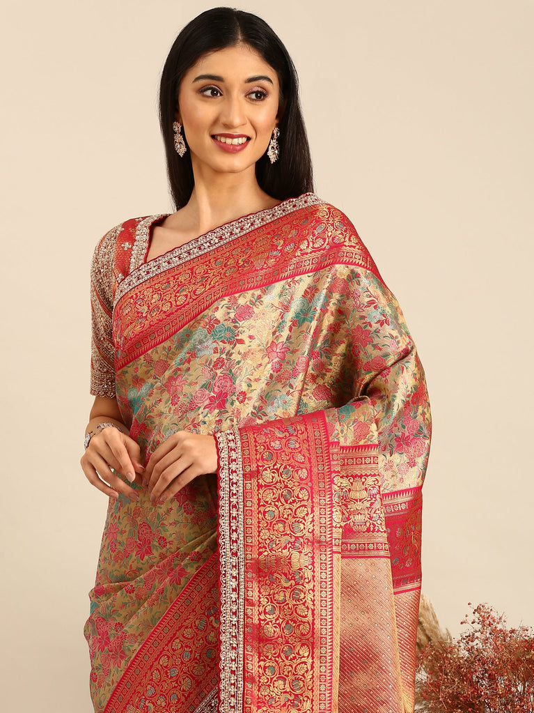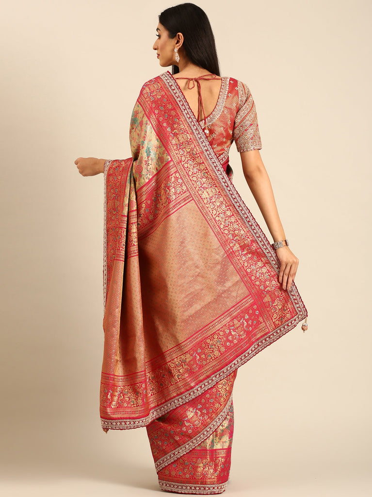 Banarasi uppada silk saree pink with allover silver & gold zari woven floral brocade weaves and zari woven border