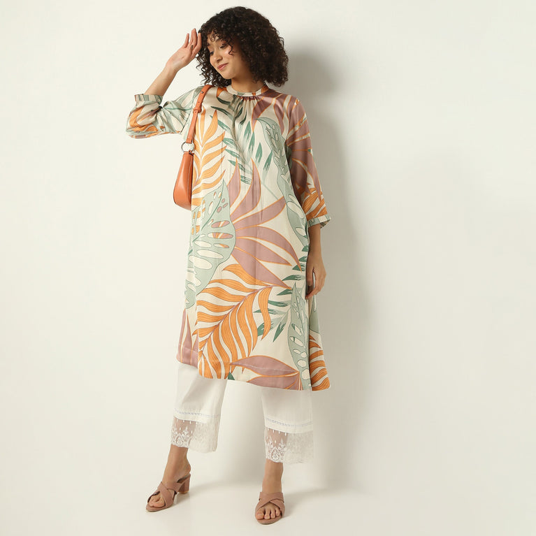 Band Collar Below Knee Three-Fourth Sleeve Flare Fit Printed Kurta
