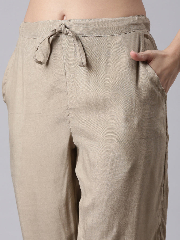 Go from casual to street smark look in a jiffy with the Solid Beige Cotton Pants. Made from cotton, it has a elasticised waistband with drawstring closure, slant pockets, mid rise & a tapered fit.