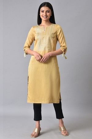 Make A Statement Look In A Day Occasion With This Pretty Beige Embroidered Kurta. The Kurta Has Zari Embroidery And Sequin Work On Yoke. The Kurta Has Round Neckline With V Cut And Sleeves Has Tassle Tie-Up.