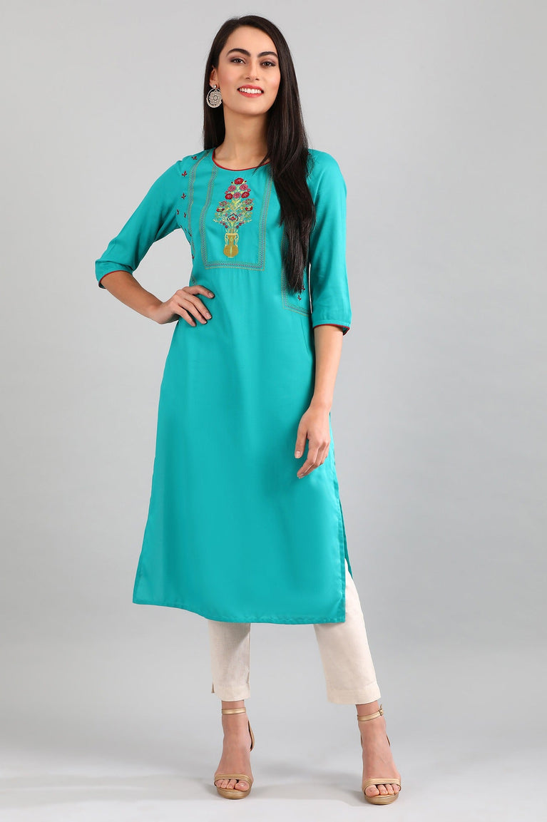 Crafted in premium fabric, which gives you all day comfort and classy look. The top has band collar with placket and elbow sleeves.