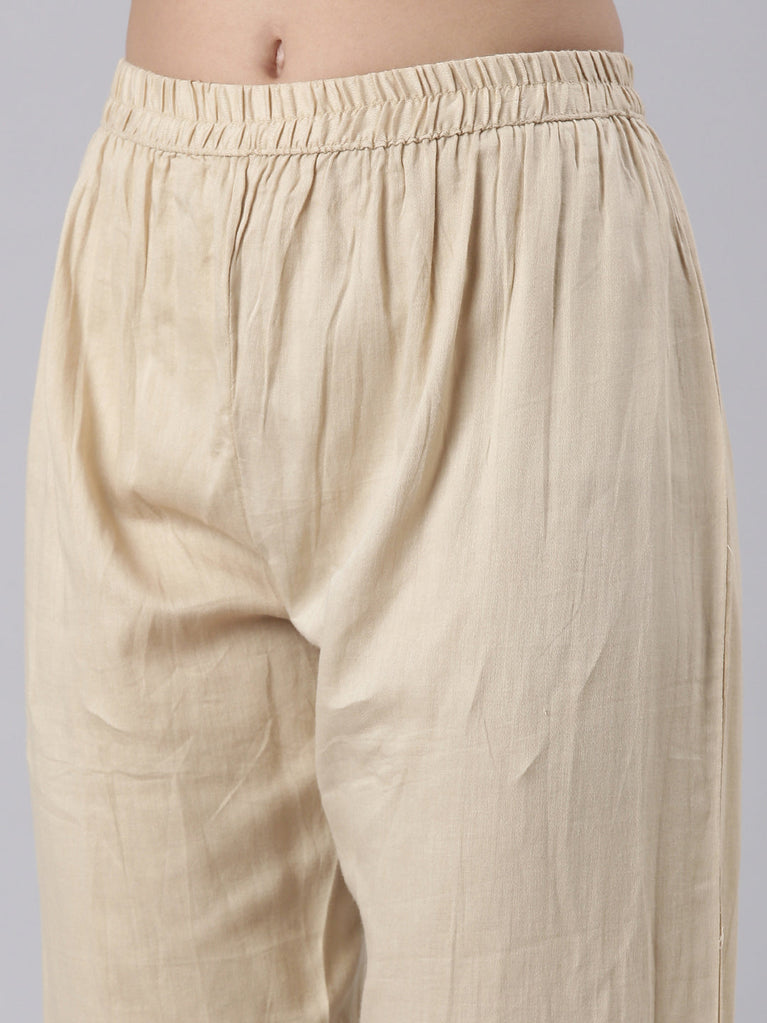 Beige Solid Rayon Straight Pants