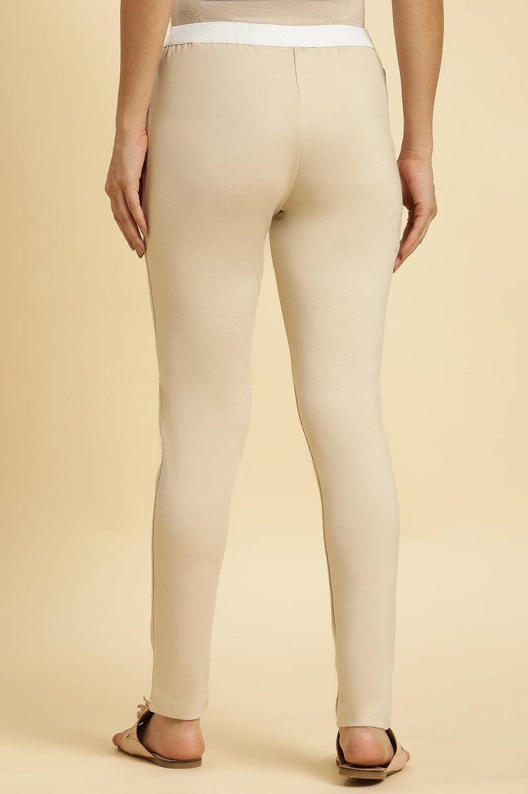 Beige Coloured Slim Fit Ankle Length Solid Tights With Elasticated Waistband.