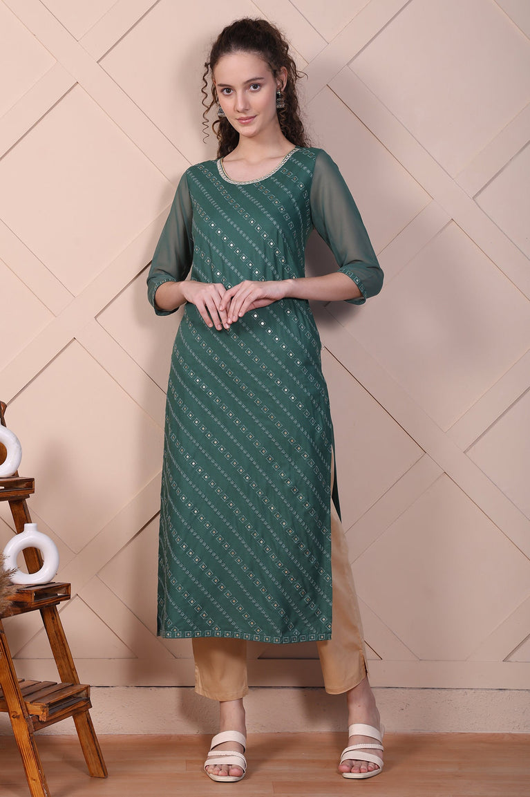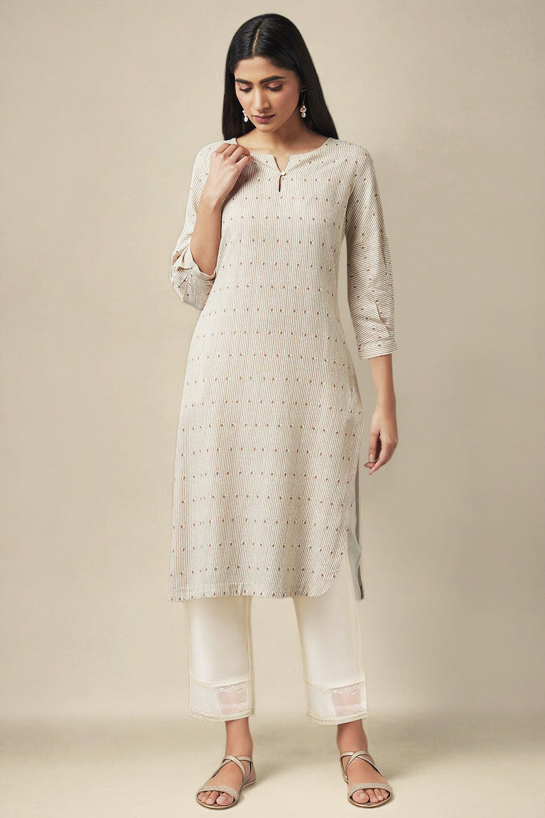 A classic beige straight fit kurta, accentuated with gold foil print and ornate trims.
