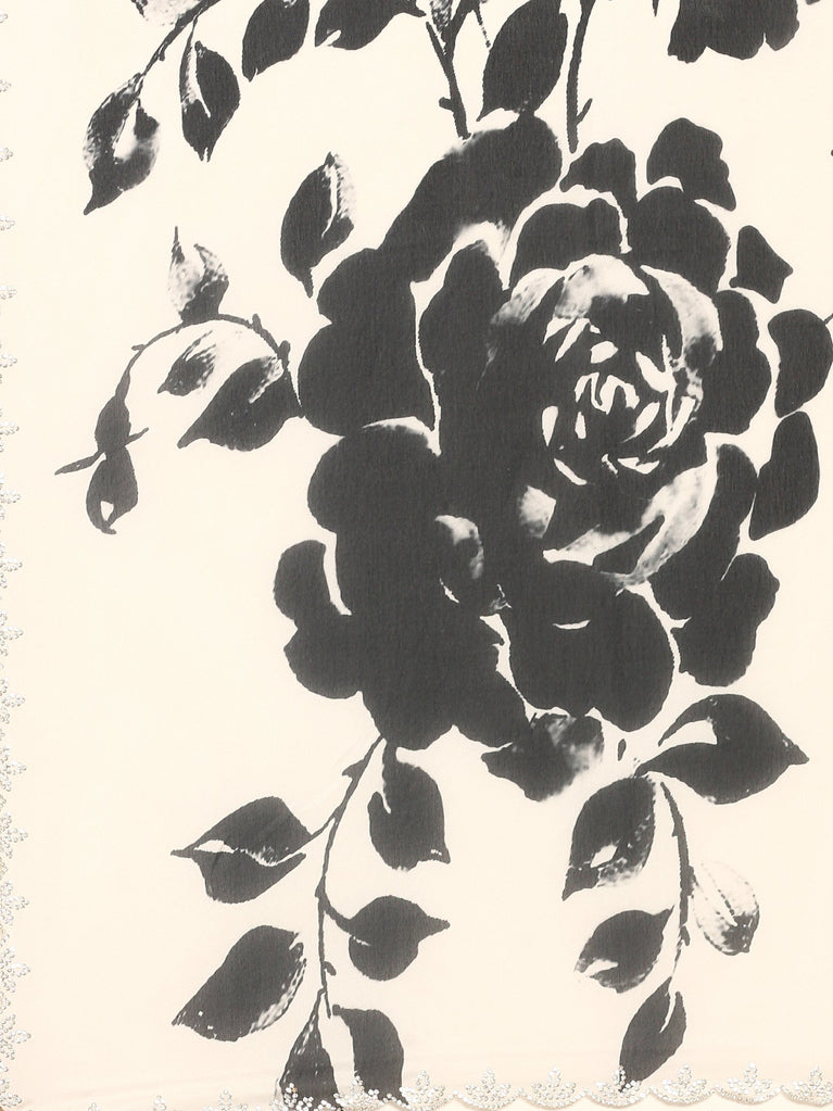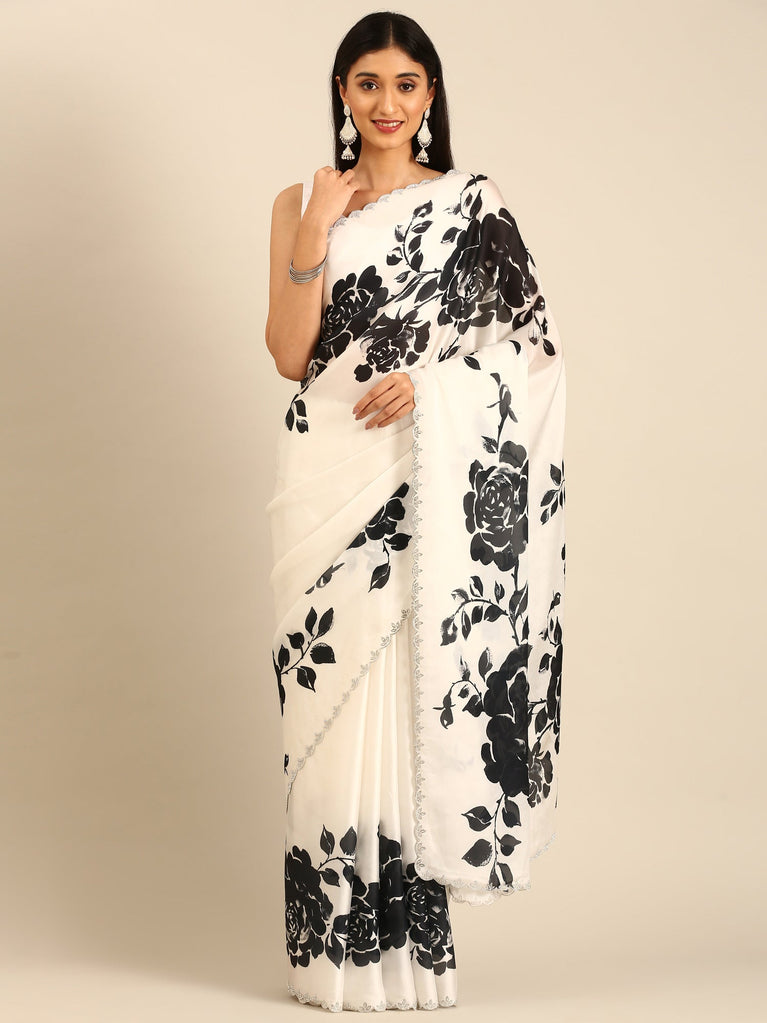 Black & white floral printed satin saree with swarovski embroidery
