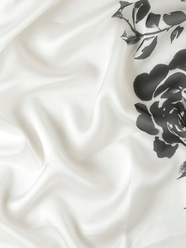 This black and white floral printed satin saree combines elegance with a touch of sparkle through exquisite Swarovski embroidery. The smooth satin fabric ensures a graceful drape, while the delicate floral pattern adds timeless charm. Perfect for special occasions, this saree offers both comfort and style, making you feel confident and