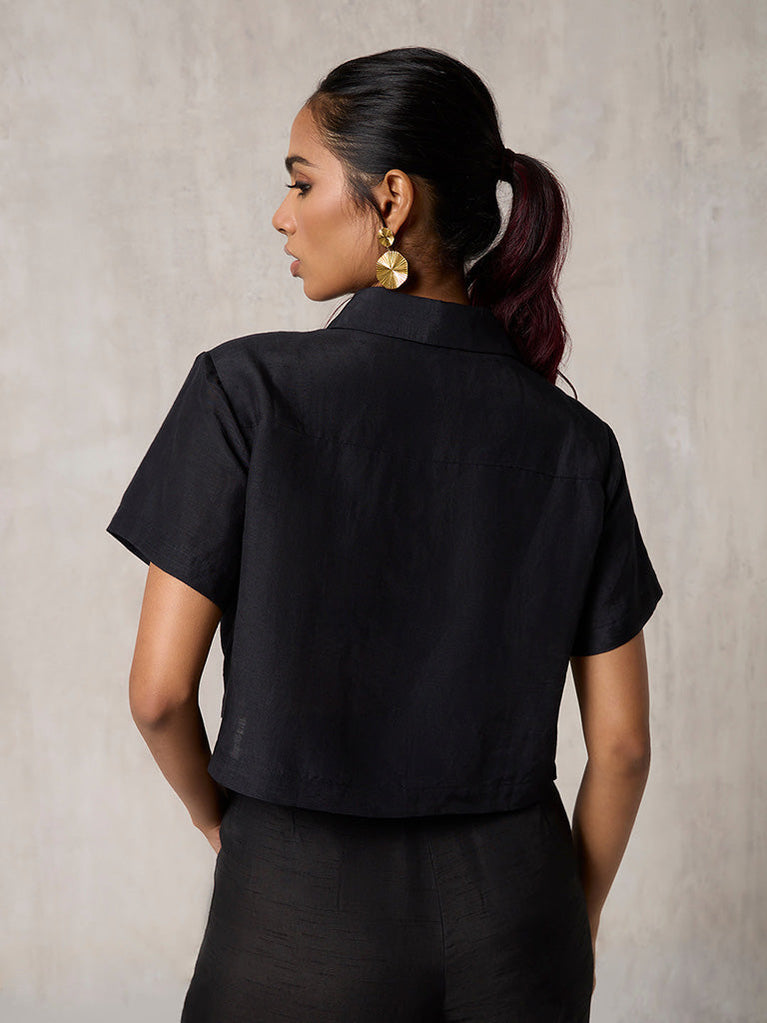 Sharp yet effortless, this black cropped shirt is elevated by ornate metallic buttons that glint softly against its matte texture. Cut in a boxy silhouette with cuffed short sleeves and a classic collar, it blends structure with ease. Pair it with wide-leg trousers or high-waisted skirts for a look that’s timeless, tailored, and quietly bold.