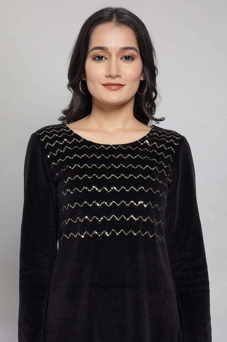 Black Festive Kurta In A Flattering Straight Silhouette With Side Slits. A Round Neckline Adorned With Intricate Jewel Neck Yoke Placement With Foil Print And Sequins Adds A Touch Of Sophistication.