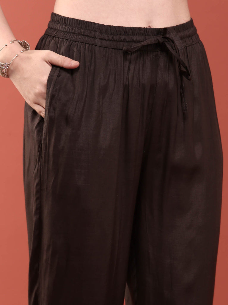 An ode to traditional craftsmanship, this black kurta set for women captures the essence of heritage with a contemporary spirit. The ensemble revolves around a graceful A-line kurta, brought to life by an all-over Bandhani-inspired print that tells a story of timeless artistry. Its round neckline is the centerpiece, adorned with exquisite and heavy embroidery that lends a touch of festive opulence. You’ll love the detail in the three-quarter sleeves which feature a gentle flare and a coordinating decorative border. This beautiful ethnic co-ord set is perfect for celebrations where you want to make a sophisticated statement. Paired with perfectly tailored straight pants that echo the delicate border at their hem, the look is both cohesive and comfortable. The outfit includes a matching dupatta, flowing with complementary ethnic motifs, completing this three-piece kurti set. The entire silhouette is crafted from an opaque fabric for confident wear, making it a stellar choice for your next event.