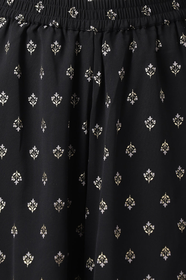 Make Heads Turn At Any Occasion In This Fashionable Black 3D Embroidered Crop Top And Semi Flare Palazzos. It Has A Pre Stitched Saree Drape Which Looks Very Gorgeous When Worn And Is Super Comfortable To Wear. It Is A Must Have This Season And Is Sure To Earn You Compliments.