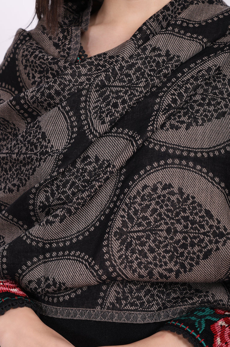 When tradition weaves itself into modern style, you get a piece as captivating as this. This designer stole for women is more than just an accessory; it’s a statement of quiet elegance. Crafted from a premium blend of soft cotton and warm wool, it feels delightful against the skin, promising comfort on crisp days. The stole's canvas is a deep, mysterious black, brought to life by an intricate all-over pattern in a contrasting shade of rich maroon. This beautiful ethnic stole features woven paisley-inspired motifs, a testament to its yarn-dyed craftsmanship that ensures the design is part of the fabric's very soul. With a generous length of 1.8 metres and a width of 70 cm, this opaque wrap offers endless styling possibilities – drape it artfully over a kurta, wrap it snugly for warmth, or let it cascade down for a dramatic effect. The texture is sublime, and the drape is fluid, making it a joy to wear. Its edges are finished with a delicate fringe, adding a classic touch to this sophisticated piece. As a versatile stole for women, it’s perfect for both festive occasions and elevating your daily winter look. This is the black and maroon woven stole you'll cherish for seasons to come.