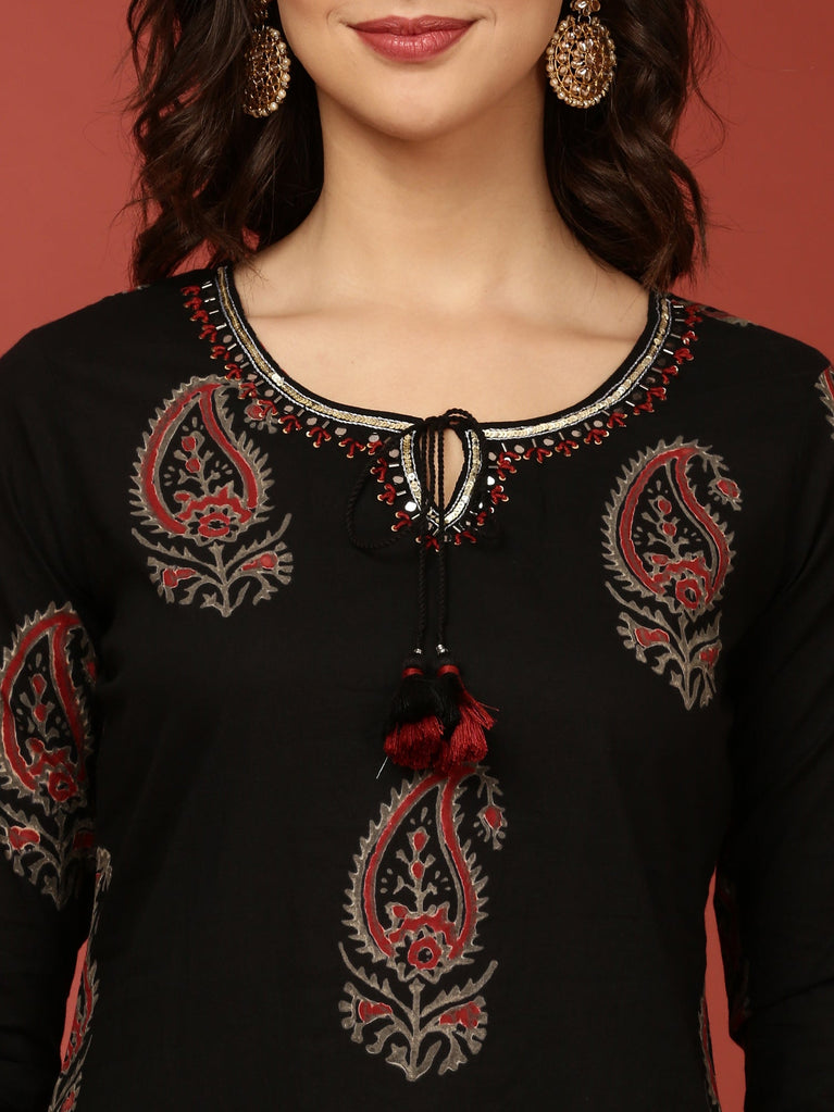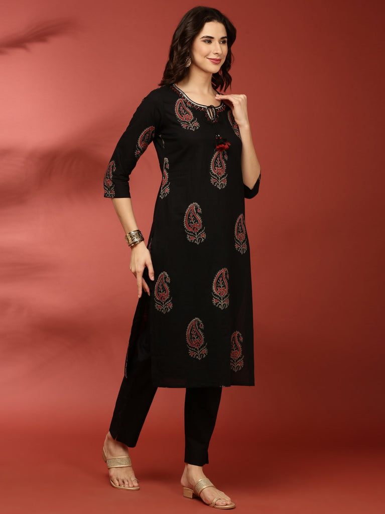 This Black Cotton Printed Three Piece Set combines timeless elegance with comfortable wear. Crafted from soft cotton, it ensures breathability and ease throughout the day. The intricate print adds a refined touch, making it suitable for both casual occasions and stylish gatherings. Designed to provide a cohesive, polished look, this set offers versatility while maintaining a sophisticated appeal.