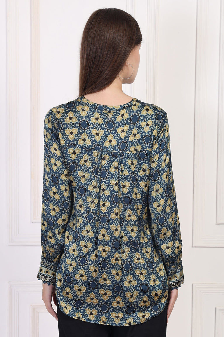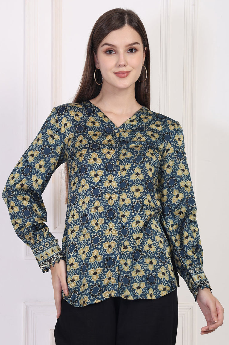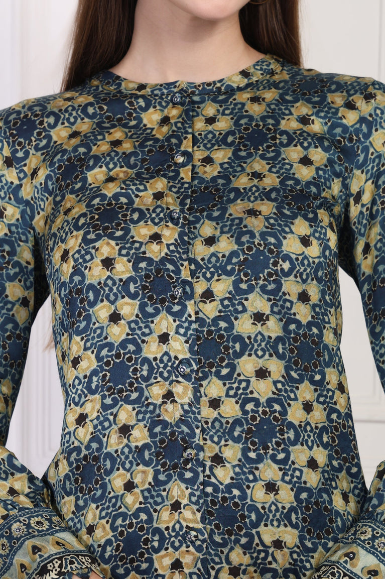 A Lustrous Modal Satin Top In Ajrakh Floral Print For Festive Occassions. Further Accented With Wide Placket With Gathers Below It And Mirror Work Buttons. Sleeves Has Pleats With Cuff.