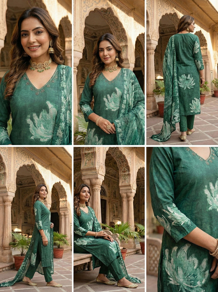 Embrace timeless elegance with this stunning three-piece set in rich bottle green muslin. Delicate floral prints add a touch of sophistication to this versatile ensemble, perfect for both casual gatherings and special occasions. The breathable muslin fabric ensures comfort throughout the day, while the coordinated pieces make styling effortless. Celebrate your personal style with a set that beautifully blends traditional charm with contemporary design.