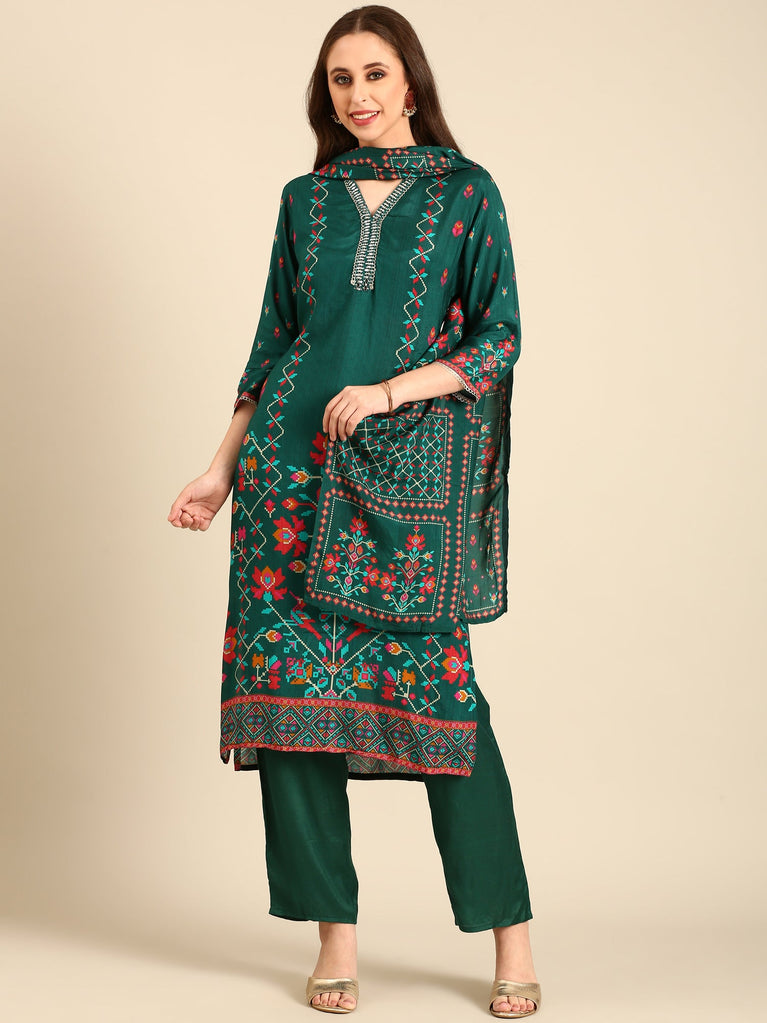 Bottle green silk anarkali embroidered three piece suit set