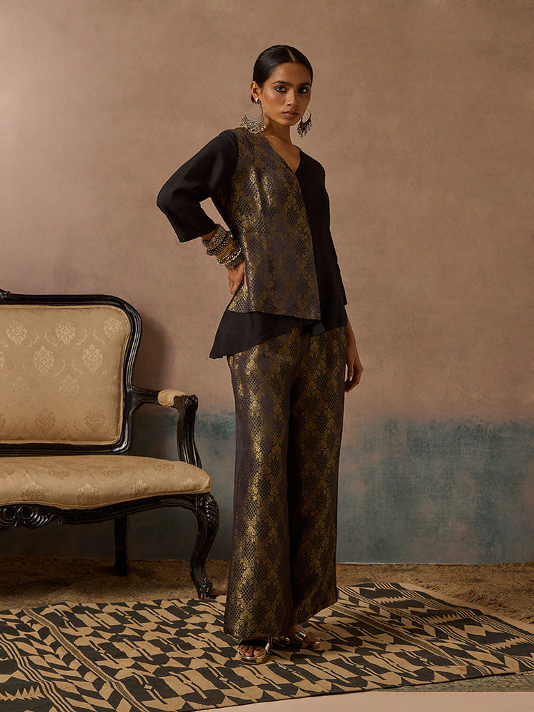 Designed for days when you want movement, shape, and a touch of texture in one quiet statement. The kurta features a V-neckline, three-quarter sleeves, and an asymmetric hemline that flares softly from the waist. A half-and-half panel design adds subtle contrast without overwhelming the look. It’s paired with wide-leg pants finished with rich brocade and an elasticated waist for a secure, easy fit.