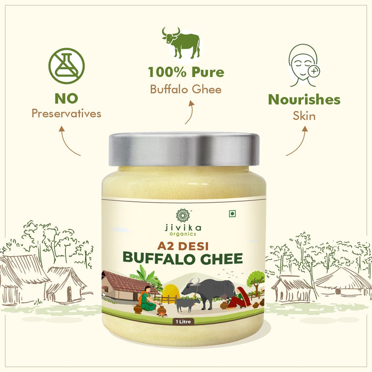 Buffalo ghee is known for its high-fat content and at Jivika we have ventured with cow herds of the Haryana region to bring this amazing Danedar Buffalo Ghee.