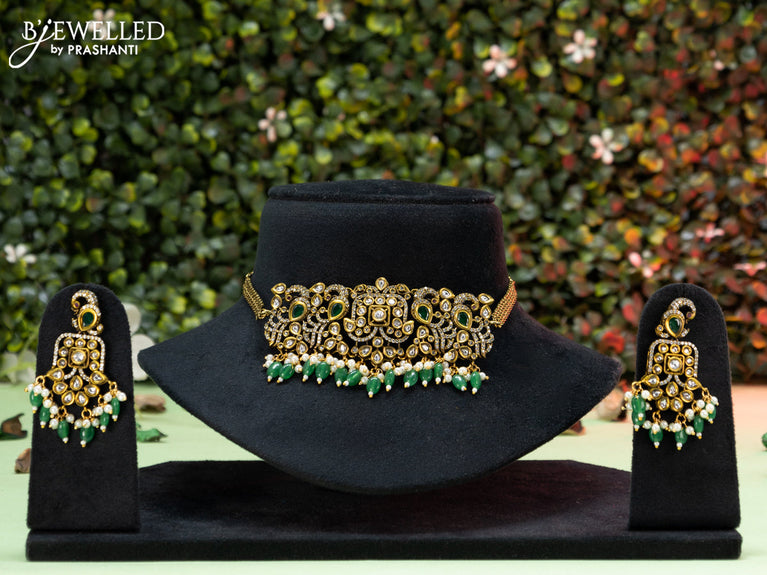 Choker peacock design with emerald & cz stones and beads hangings in victorian finish