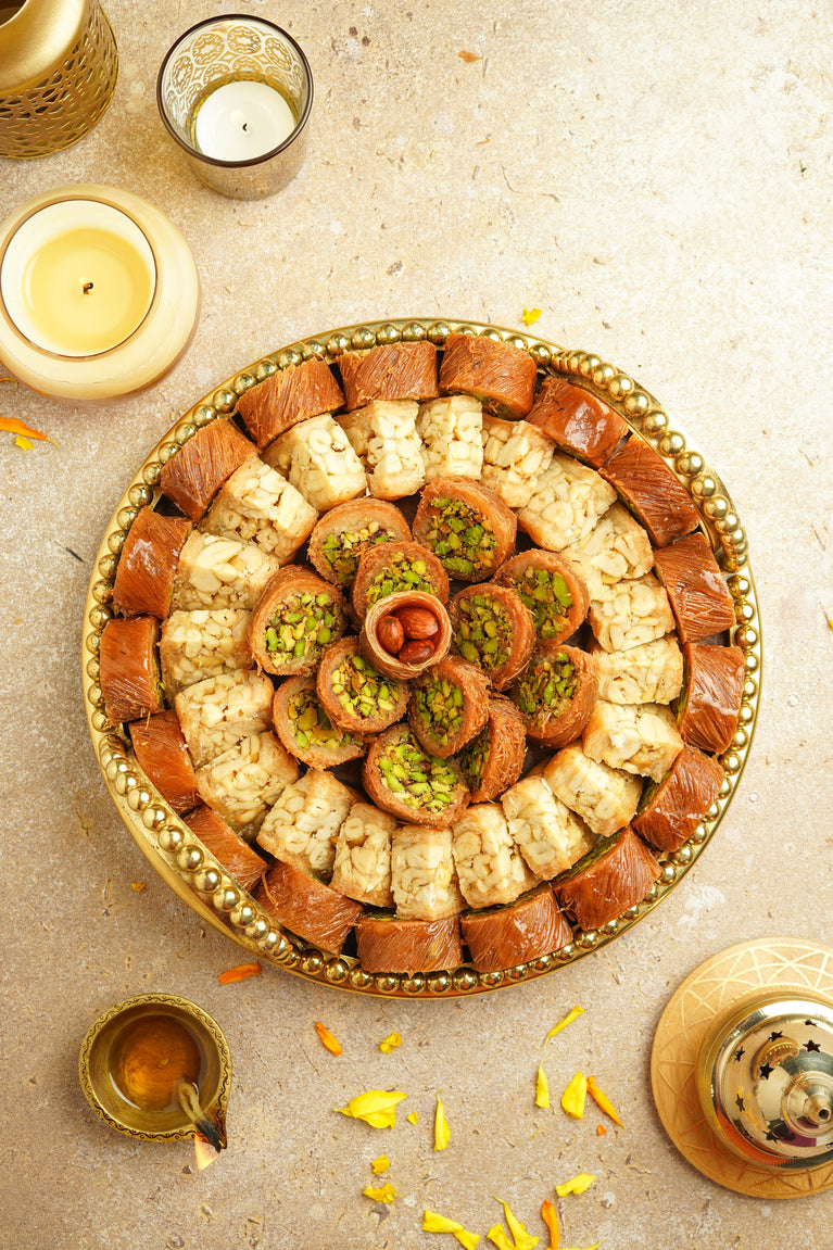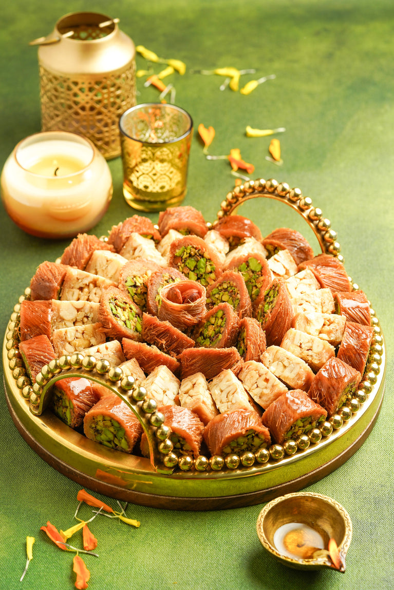 9 Pieces of Cashew Baklava, 9 Pieces of Pista Baklava, 8 Pieces of Almond Nest and Cashew Nest, 7 Pieces of Tamaria, 30 Pieces of Lady Finger, 15 Pieces of Cashew Warbat, 9 Pieces of Walnut Baklava, and 6 Pieces of Belloria