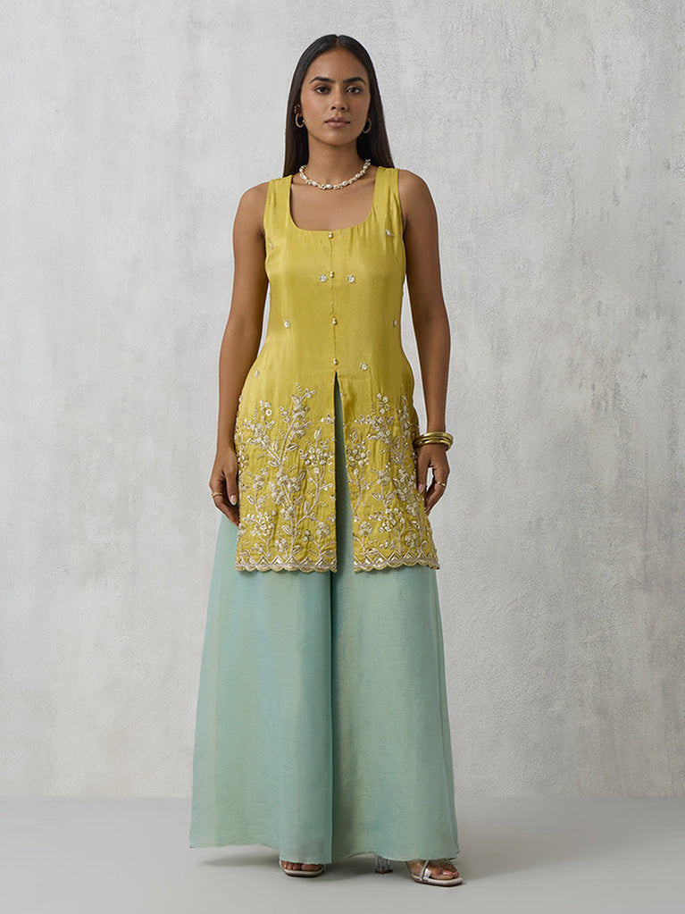 Infused with festive charm, this yellow sleeveless kurta is tailored in a sleek silhouette with a flattering scoop neck and a front slit for ease of movement. The design is highlighted with delicate sequin and bead embellishments across the front, while the hemline is richly embroidered with floral motifs that add depth and elegance.
