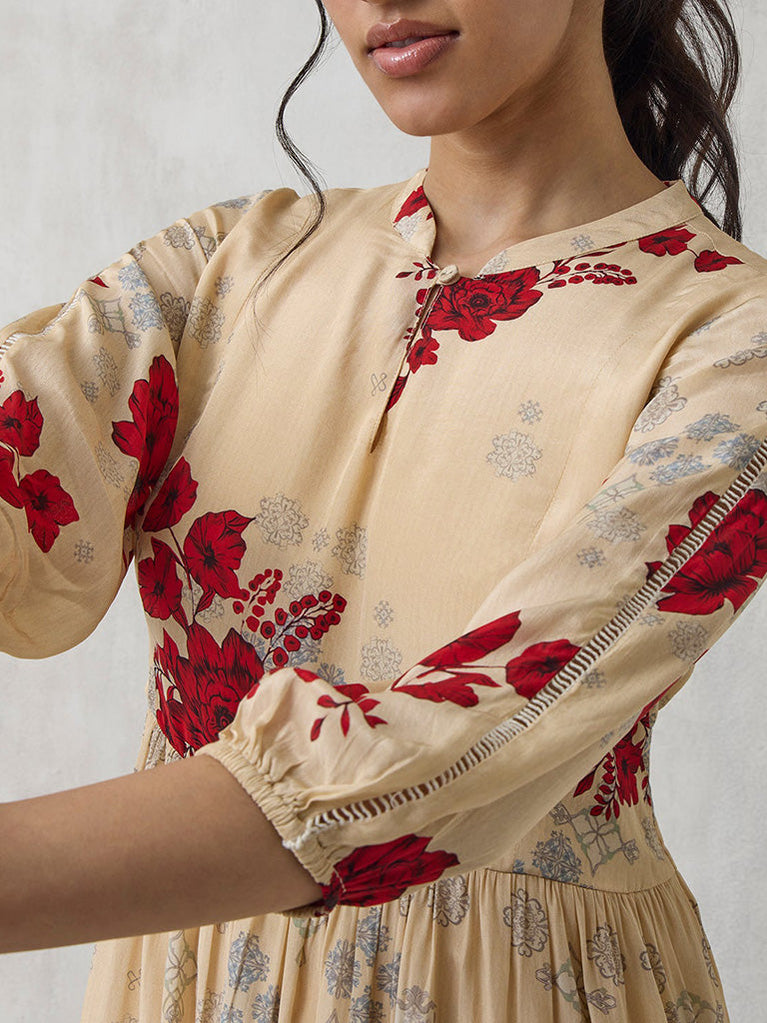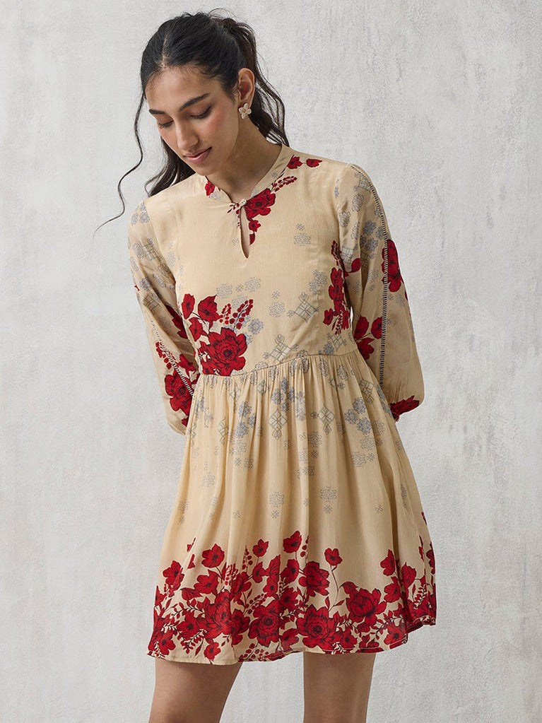 Brighten up your everyday collection with this beige mini dress crafted from a lightweight fabric for added comfort. This A-line dress is fashioned with a notched collar and button-fastening, three quarter sleeves as well as floral motifs all over for a feminine touch. It styles well with block heels and minimalistic jewellery for a chic outfit.