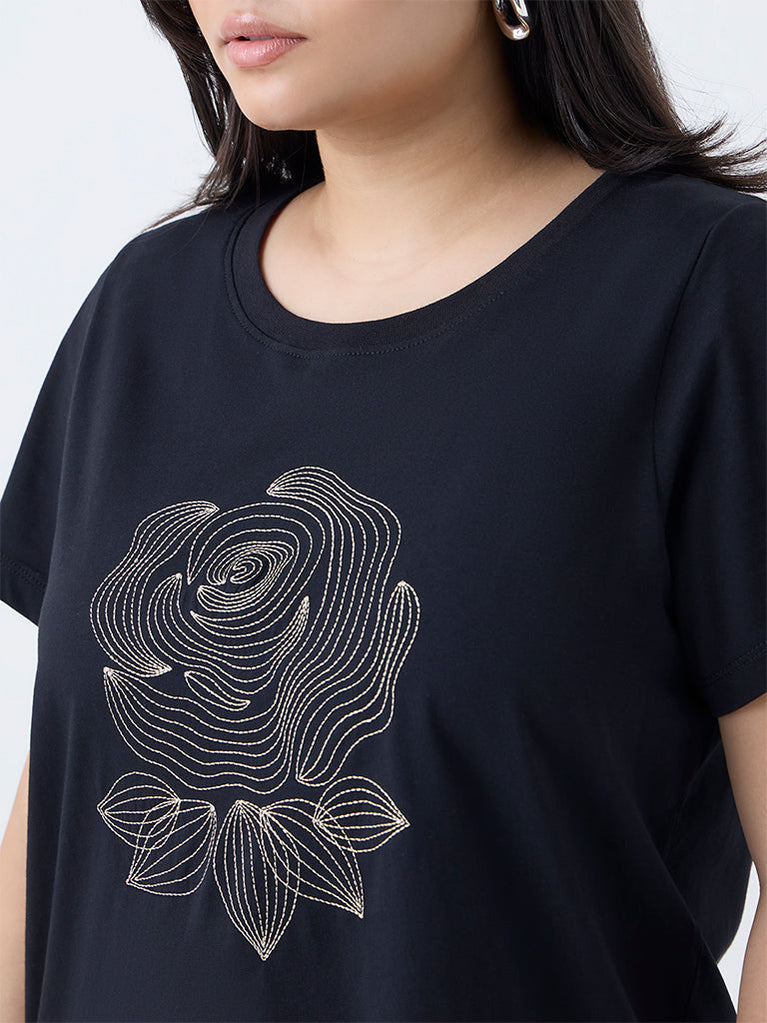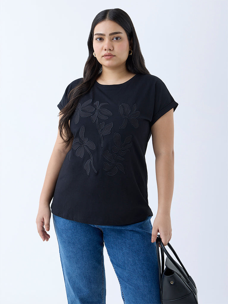 Refresh your casual wardrobe with this black cotton t-shirt from Gia, featuring intricate floral embroidery that adds a feminine charm. Designed with a classic round neck and short sleeves, it offers effortless style and comfort for everyday wear.
