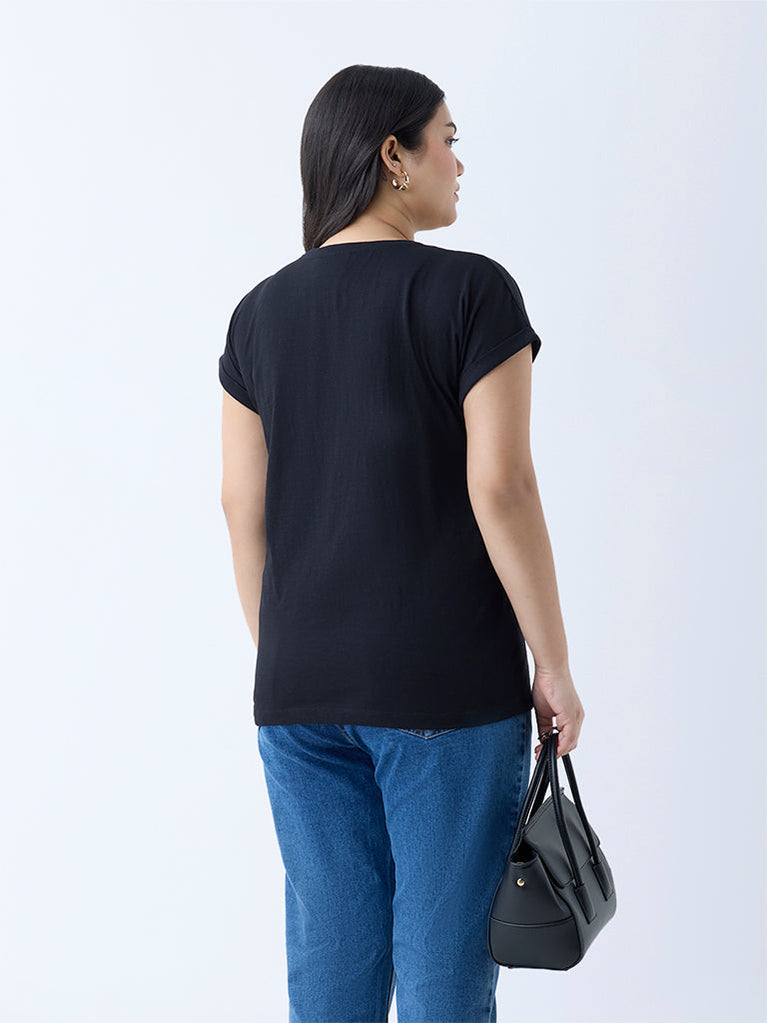 This black t-shirt from Gia brings a subtle twist to everyday dressing with its understated floral print. Spun from pure cotton for all-day ease, it features a classic round neck and upturned dolman sleeves that add a thoughtful finish.