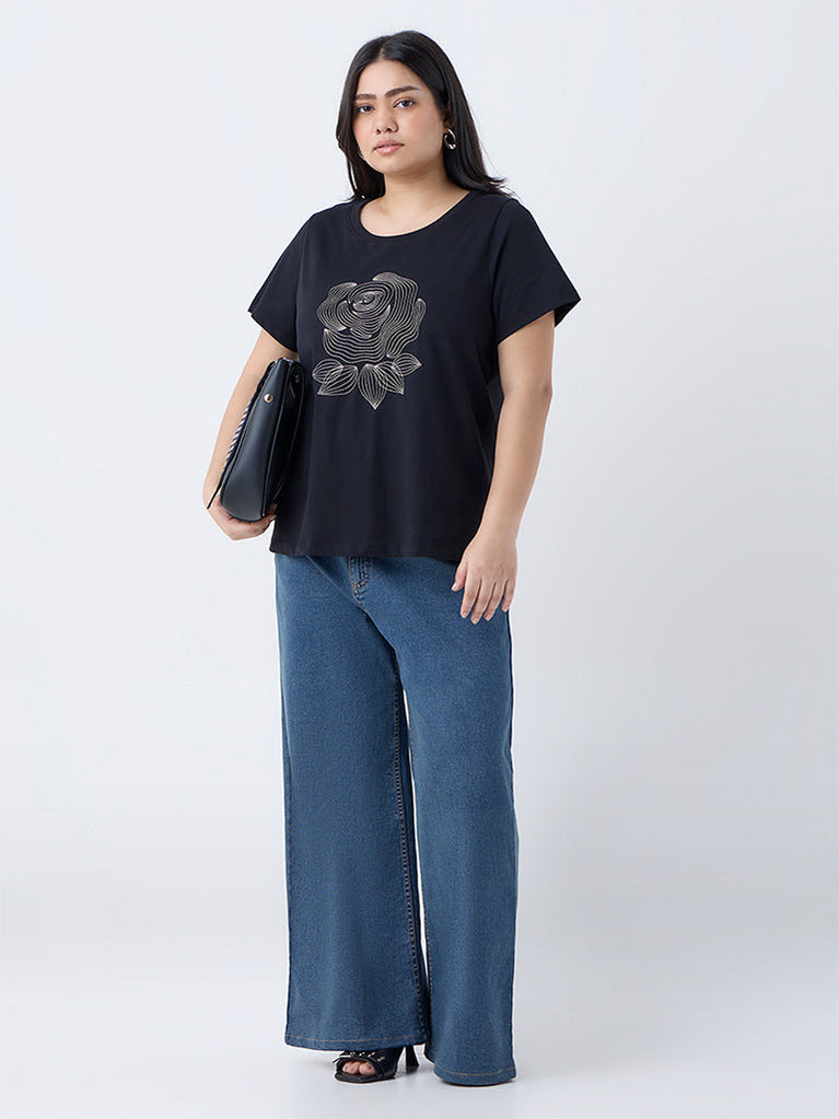 Black tee by Gia accented with foliage motifs that bring a refined, nature-inspired charm. Crafted from pure cotton, it feels soft against the skin while offering a relaxed, curve-friendly fit. Finished with a classic round neck and short sleeves, it is an everyday piece that balances comfort and quiet style with ease.
