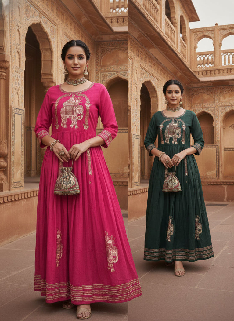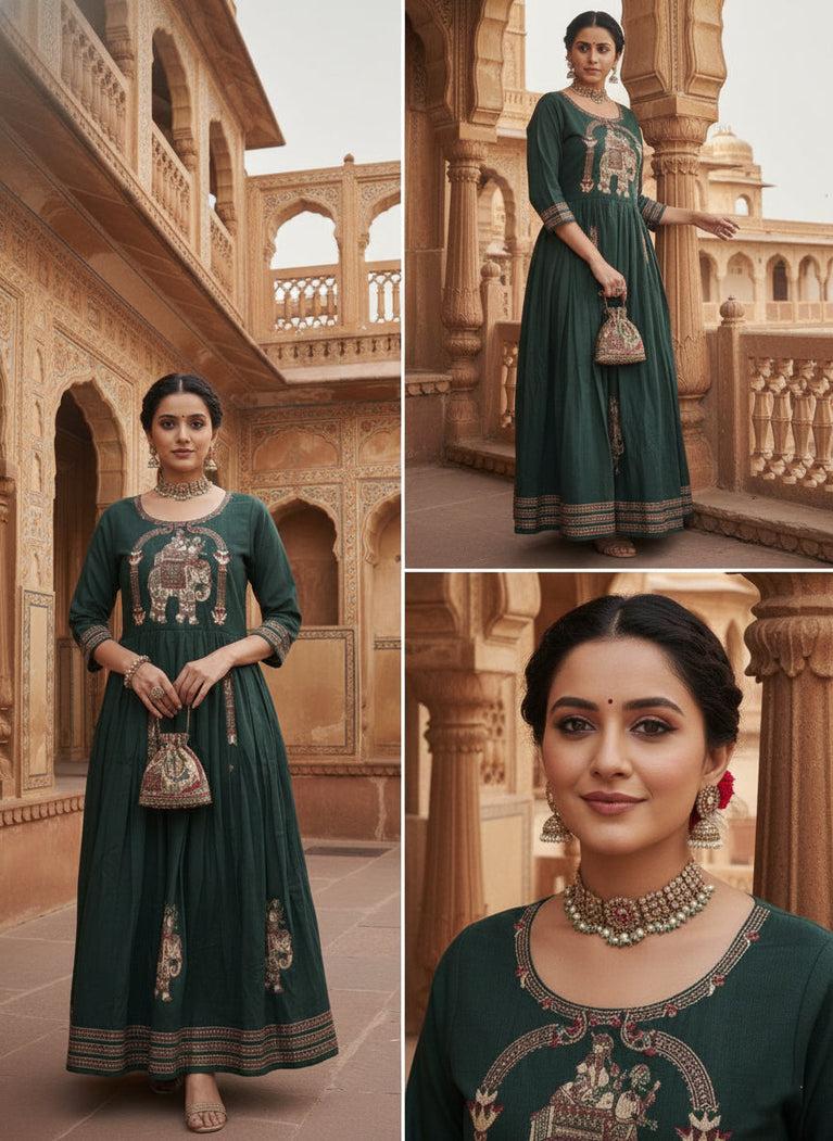 Elevate your festive wardrobe with this Green and Mustard digital printed embroidered Anarkali three-piece set. Featuring intricate embroidery and vibrant digital prints, it blends traditional charm with contemporary style. The flattering Anarkali silhouette offers a graceful fit, while the coordinating pieces complete a stunning ensemble perfect for special occasions. Experience elegance and comfort in one exquisite outfit.