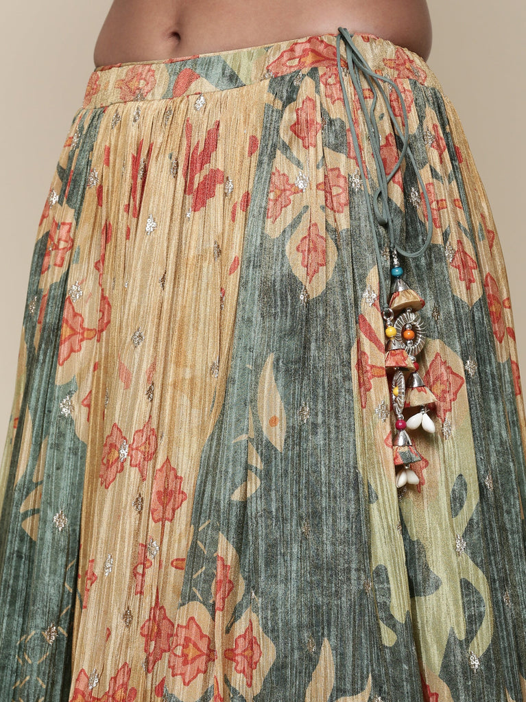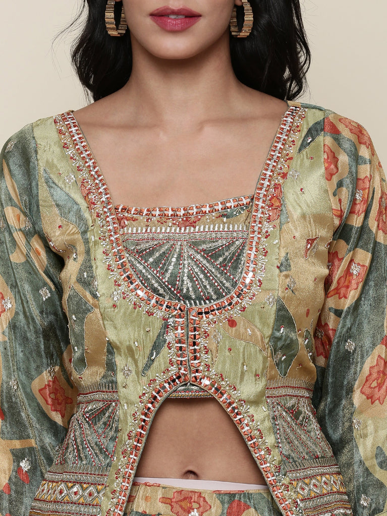 Green Tissue Printed Embroidery Three Piece Suit Set